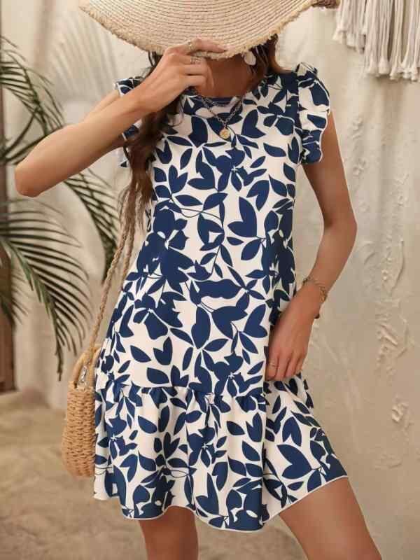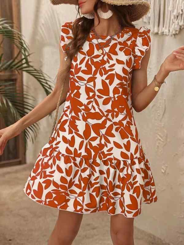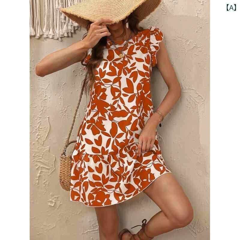 ワンピース レディース 欧米風 ゆったり ショート丈 ラウンドネック 半袖 花柄 プリント フリル エレガント 上品 通勤 オフィス カジュアル ポリエステル ポリウレタン オレンジ系 ブルー系