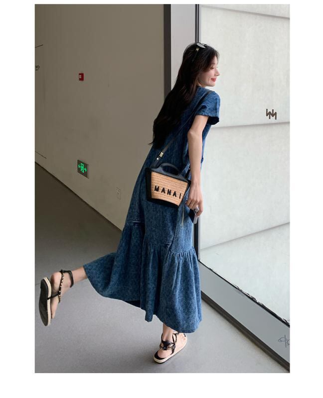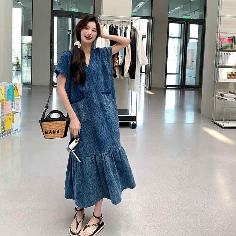 ワンピース レディース ブルー デニム 夏 Vネック 半袖 レトロ ヴィンテージデザイン ゆったり マーメイド ロング丈 通勤 オフィス きれいめ