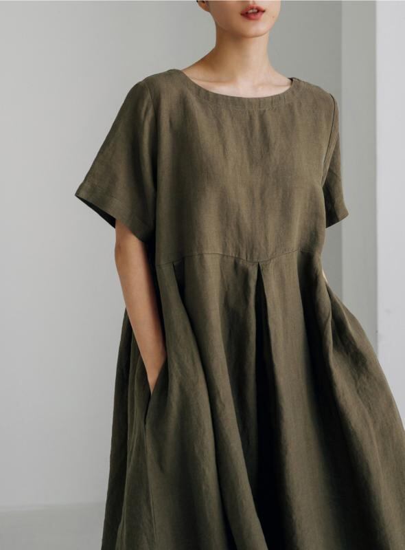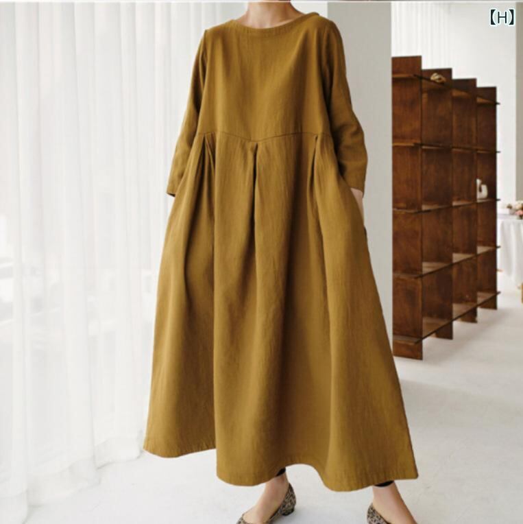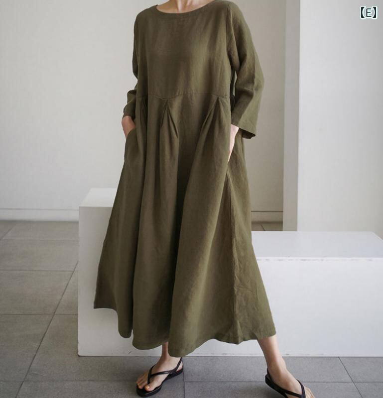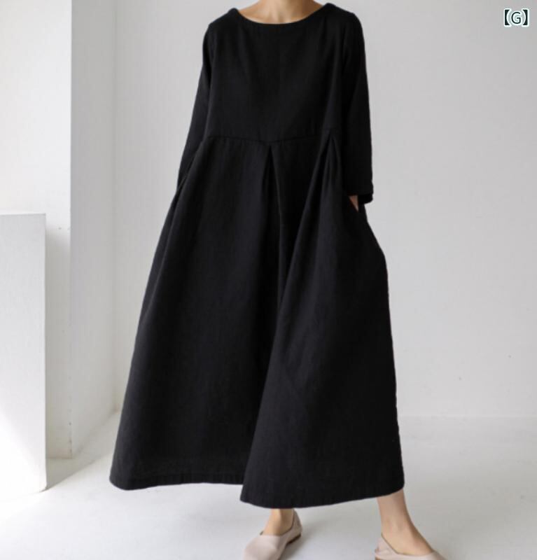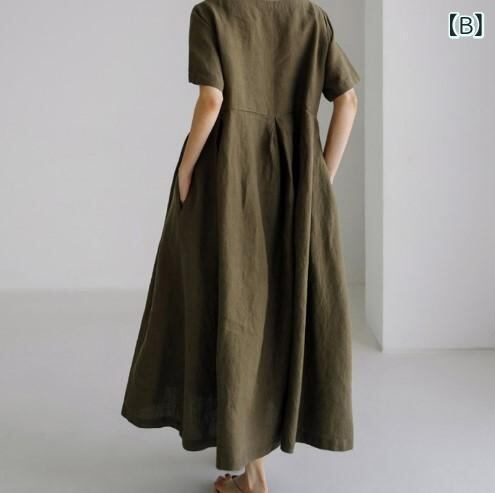 ワンピース レディース 夏用 綿麻 コットンリネン ゆったり ルーズ ロング丈 マキシ丈 ラウンドネック 半袖 プルオーバー 無地 日韓カジュアル 森ガール スクール風