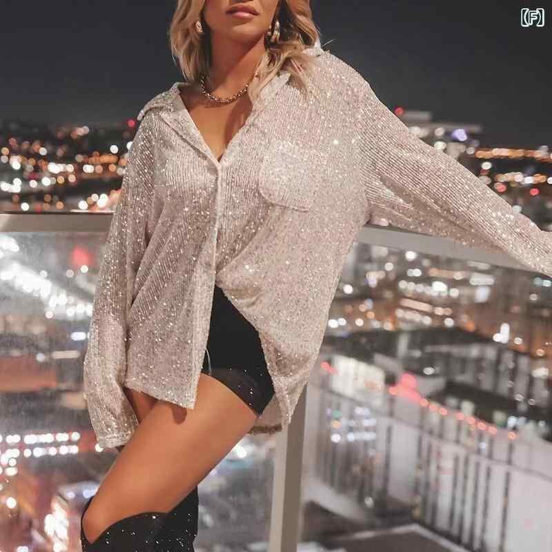 シャツ レディース スパンコール 長袖 襟付き トップス きれいめ カジュアル オフィス 通勤 ロング丈 スリムフィット ポリエステル 無地 キラキラ 光沢感 上品 細見え 普段使い お出かけ