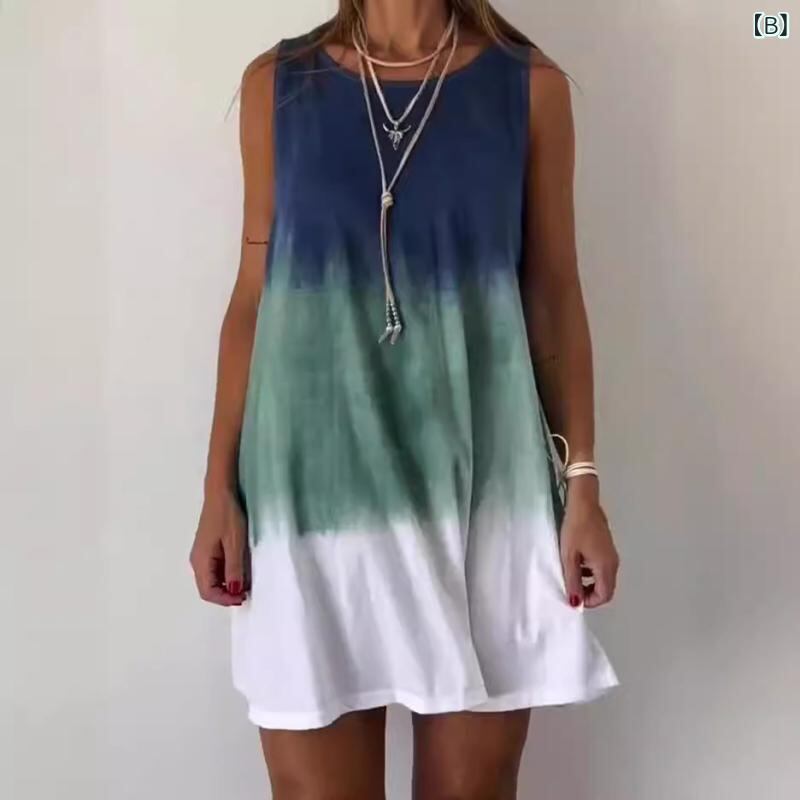 ワンピース レディース ラウンドネック ノースリーブ グラデーションプリント カジュアル Aライン ミディ丈 綿混紡 ポリエステル ゆったりシルエット 欧米風 ストリートファッション トレンド カーキ ライトグリーン ブルー パープル