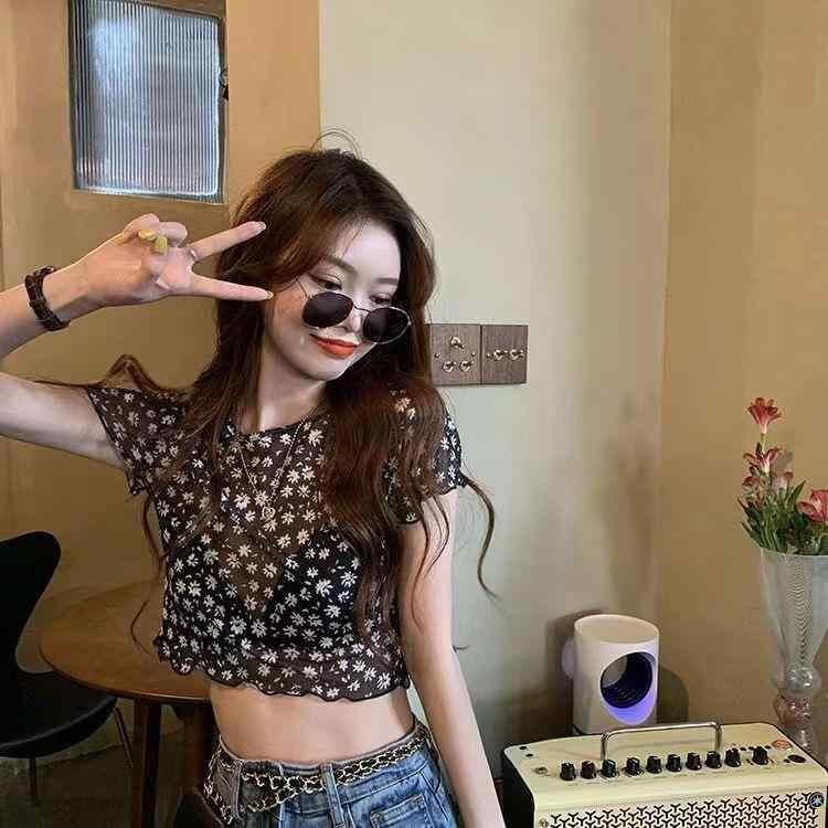 Tシャツ レディース 女性用 小花柄 デイジー フラワー プリント シアー 透け感 メッシュ素材 ショート丈 クロップ丈 お腹見せ スリムフィット 細身 半袖 ラウンドネック 丸首 プルオーバー セクシー ギャル カジュアル ポリエステル