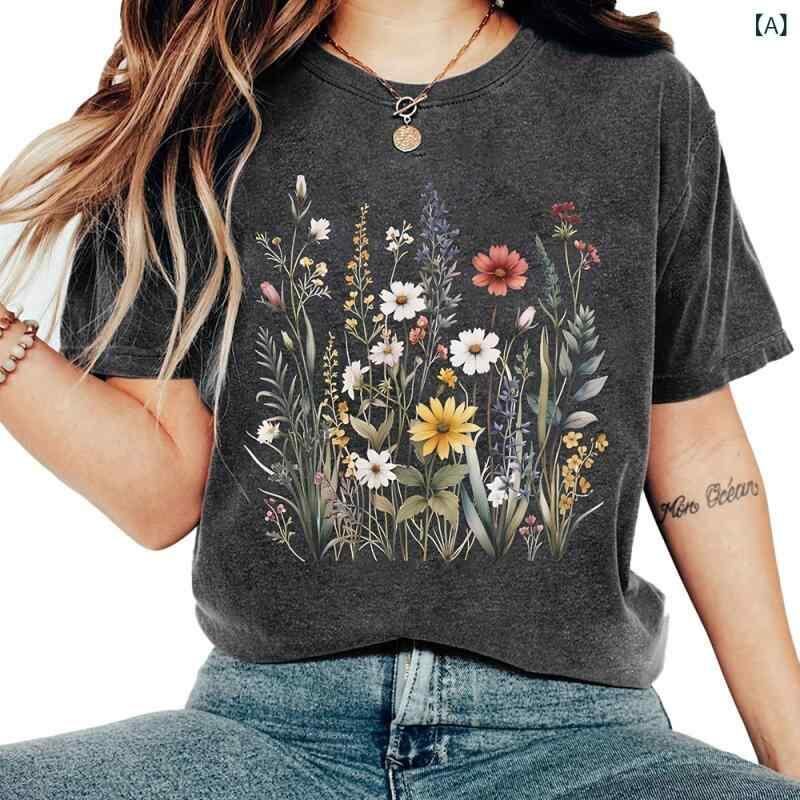 Tシャツ レディース 植物 花柄 プリント ラウンドネック 半袖 綿素材 ゆったり カジュアル プルオーバー レギュラー丈 ダークグレー