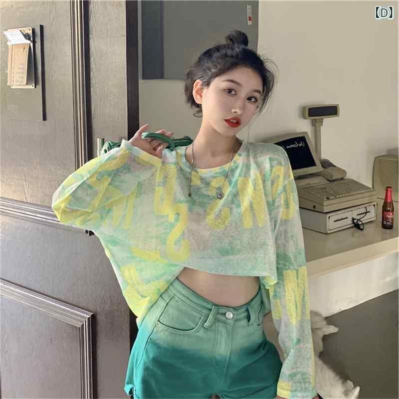 トップス レディース 夏 薄手 UVカット 日焼け防止 接触冷感 タイダイ柄 グラデーションカラー メッシュ シアー 長袖 ロングスリーブ ゆったり ルーズ プルオーバー ポリエステル 再生繊維 カジュアル リラックスウェア デイリーユース