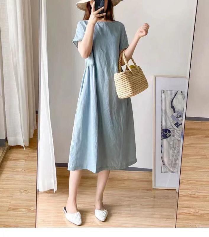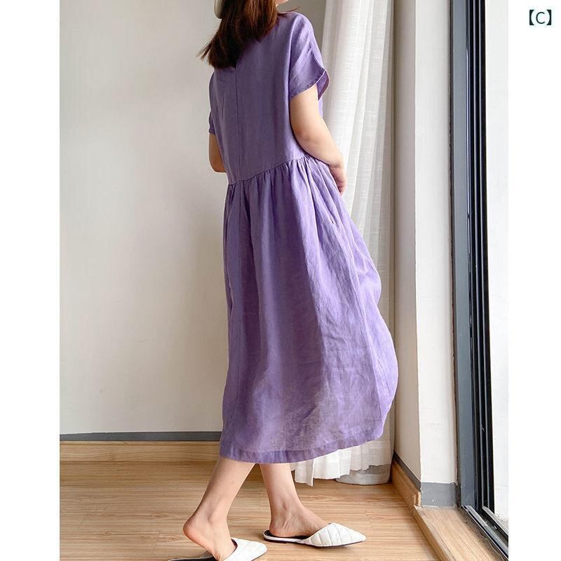 ワンピース レディース 日韓風 シンプル レトロ ゆったり 体型カバー 着痩せ効果 大きいサイズ プラスサイズ ぽっちゃりさん向け ミモレ丈 Aライン Vネック 半袖 綿 無地