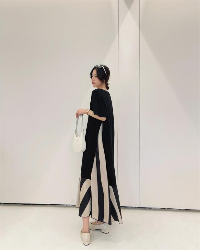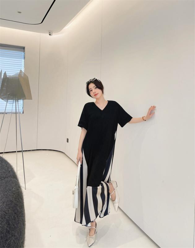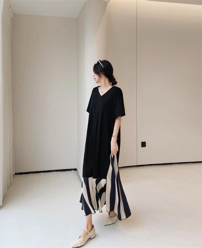 ワンピース レディース ロング丈 ゆったり 大きいサイズ Vネック 半袖 ドッキング 変形切り替え ストライプ柄 コットン Aライン プルオーバー ブラック 通勤 オフィス カジュアル エレガント