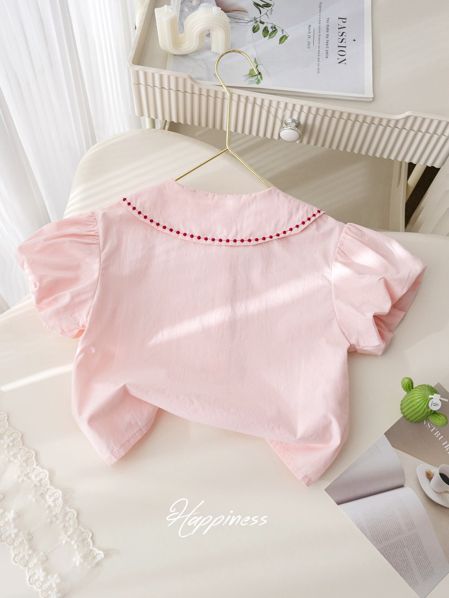 ブラウス キッズ 女の子 半袖 パフスリーブ 刺繍 フリル 丸襟 かわいい プリント おしゃれ ガーリー 韓国風 トップス 綿 コットン 柔らかい素材 普段使い 夏物