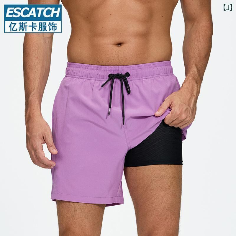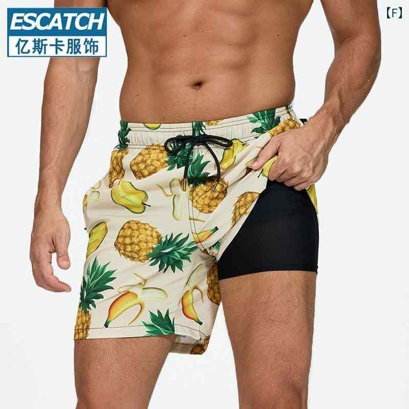 ビーチパンツ メンズ 速乾 ダブルレイヤー スイムパンツ 水陸両用 プリント柄 チェック 花柄 ショートパンツ カジュアル スポーツ ポリエステル スパンデックス 伸縮性 4WAYストレッチ インナー付き アウトドア 夏