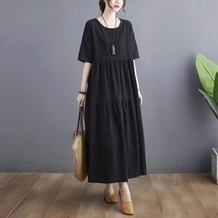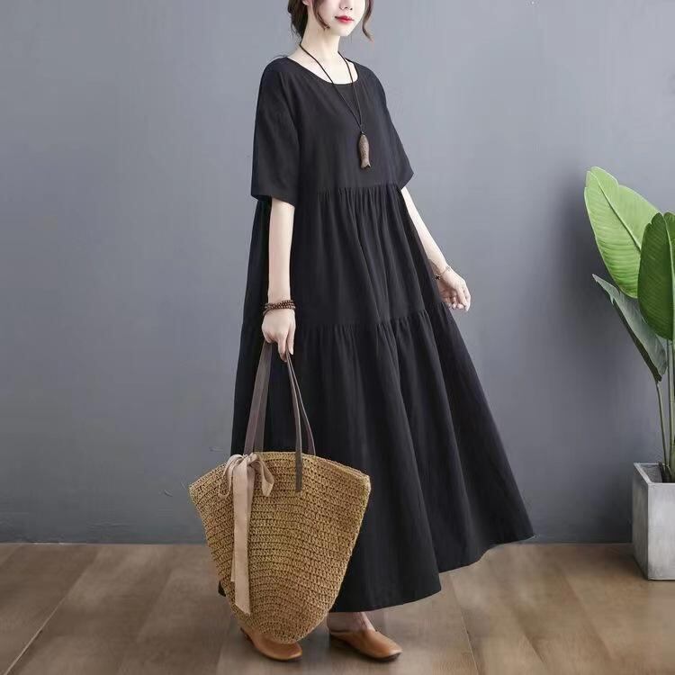 ワンピース レディース 大きいサイズ 半袖 綿麻 ポリエステル ブラック ゆったり 体型カバー 細見え ロング丈 ナチュラル カジュアル 切り替え Aライン ラウンドネック 無地 ポケット付き イージーケア