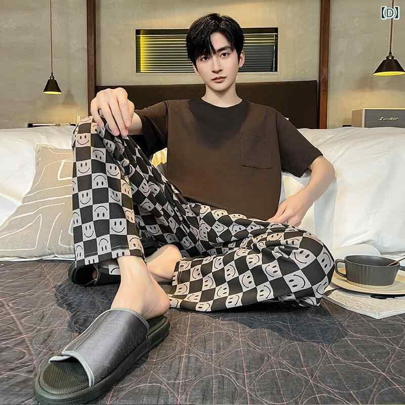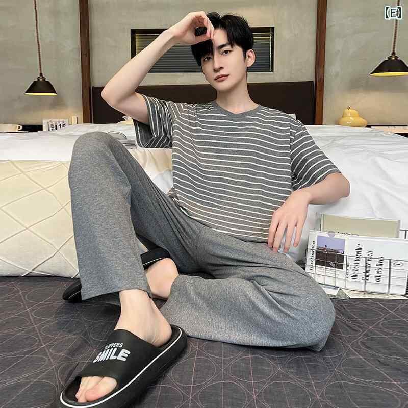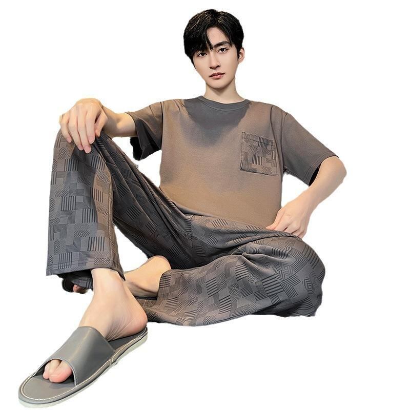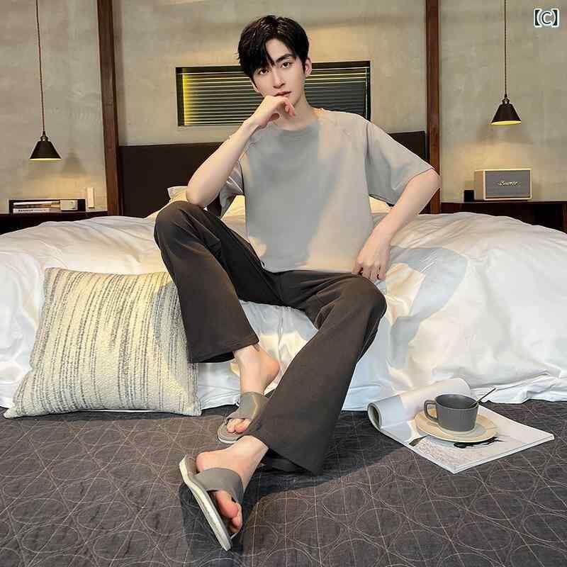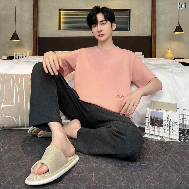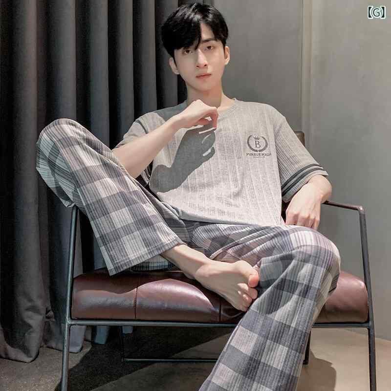 パジャマ メンズ 男性用 ルームウェア 綿100% コットン 上下セット 丸首 半袖 長ズボン ロングパンツ 薄手 薄地 夏用 カジュアル リラックス 快適 通気性 ストレッチ 伸縮性 大きいサイズ 部屋着 ワンマイルウェア