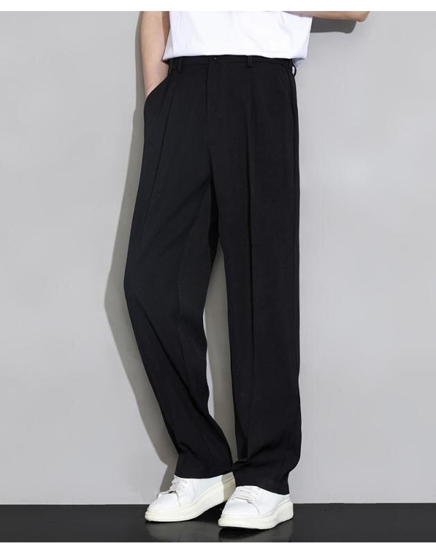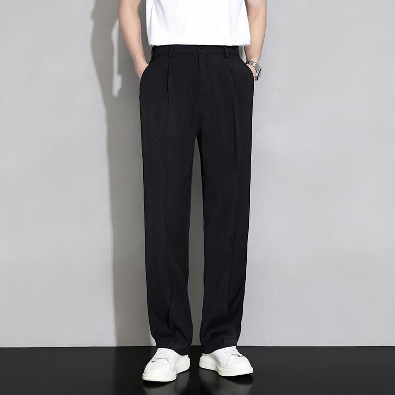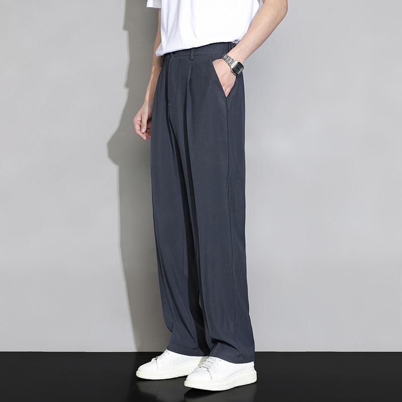スラックス メンズ 夏 接触冷感 薄手 ゆったり ワイドストレートパンツ ドレープ感 シワになりにくい 通気性 ポリエステル混紡 ストレッチ 普段使い ビジネス カジュアル ブラック ダークグレー カーキ