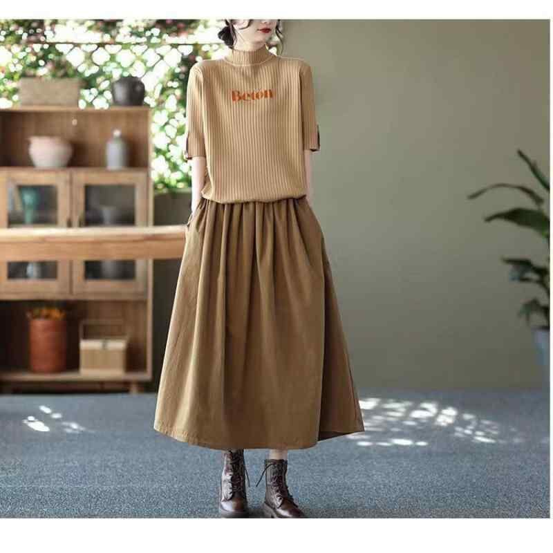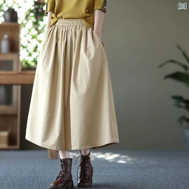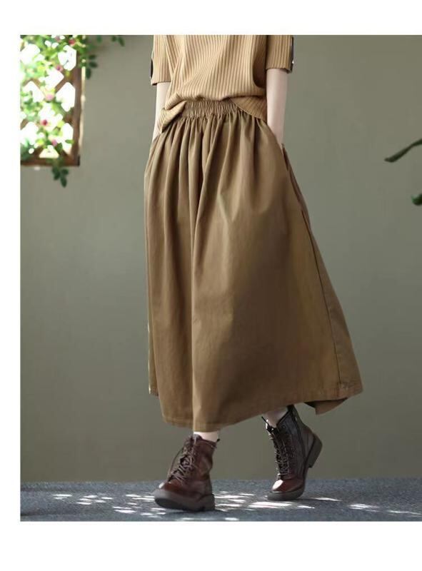スカート レディース コットン 春夏 着痩せ効果 ウエストゴム Aライン 無地 大きいサイズ ゆったり 体型カバー ロング丈 フレアスカート ポケット付き 微ストレッチ 上品 通勤 オフィス カジュアル ブラウン ライトカーキ ブラック