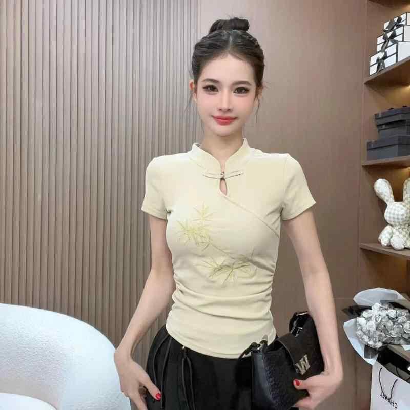 Tシャツ レディース 黒 ブラック ポリエステル スタンドカラー 立ち襟 半袖 透かし編み レース 精緻刺繍 エレガント チャイナボタン 飾りボタン ネオチャイニーズ風 中国風 植物柄 レギュラーフィット カジュアル トップス