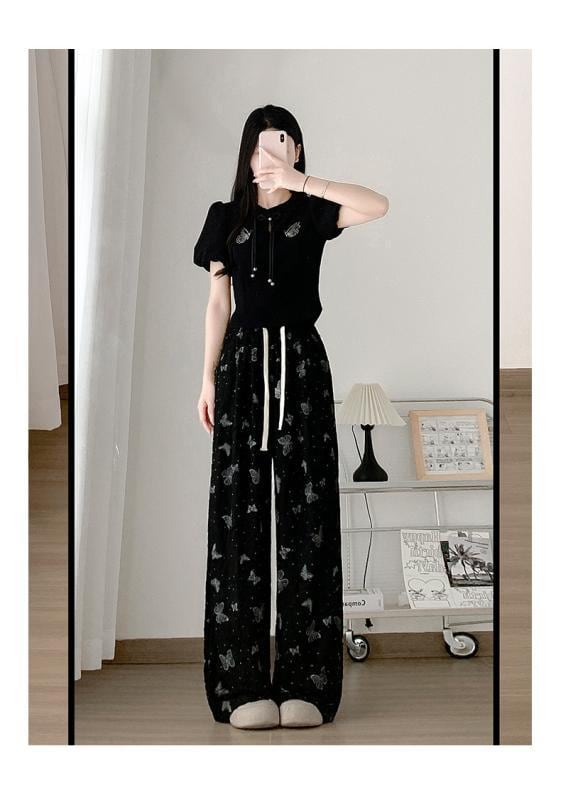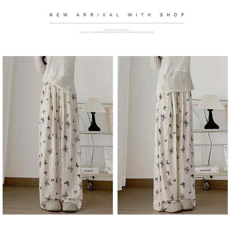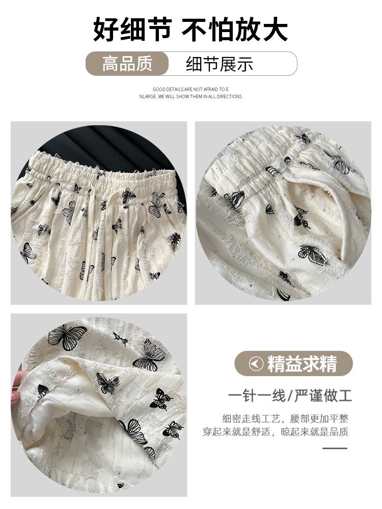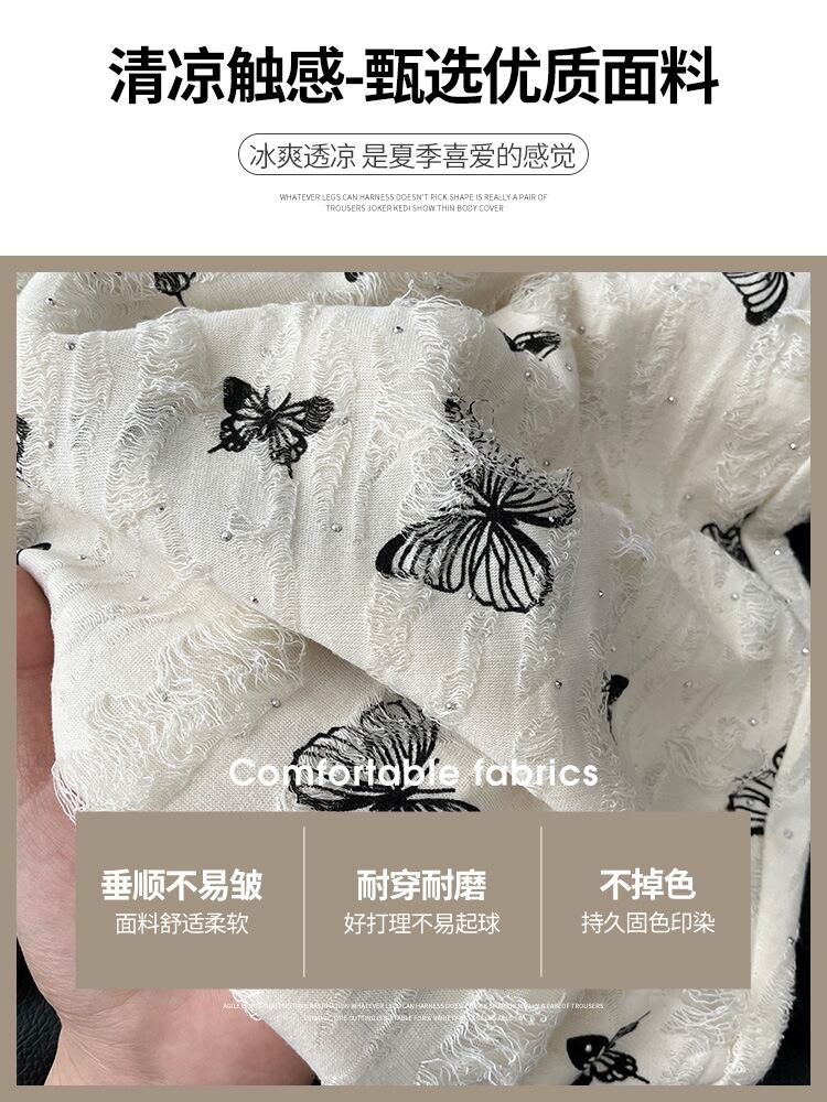 パンツ レディース ストレートパンツ 接触冷感 ハイウエスト ドレープ感 薄手 微ストレッチ カジュアル リラックス 低身長 蝶々柄 ダメージ加工 ホワイト ポリエステル レーヨン