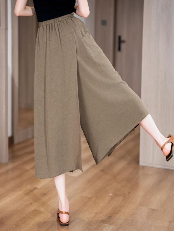 カジュアルパンツ レディース 夏 薄手 ゆったり ハイウエスト スリット スカート見え 八分丈 ワイドパンツ 体型カバー 美脚効果 ポリエステル スパンデックス混紡 伸縮素材 シワになりにくい お手入れ簡単 普段使い ルーズフィット
