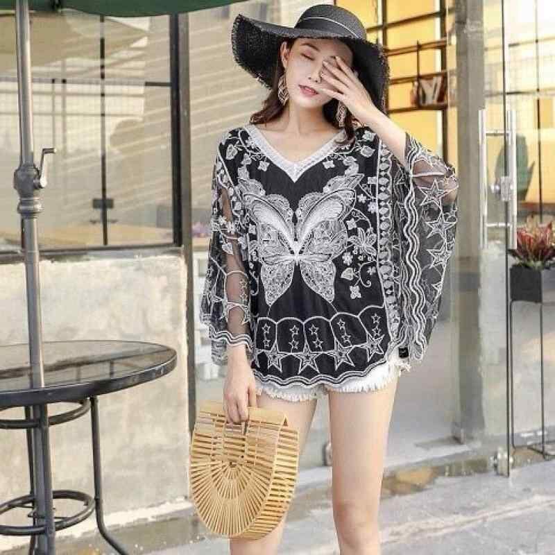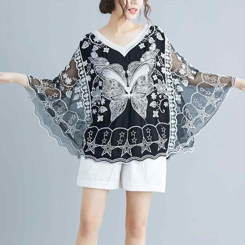 ブラウス レディース 刺繡 レース ドルマンスリーブ ベルスリーブ 七分袖 Vネック 綿 プルオーバー トップス ゆったり UVカット 日よけ エスニック レトロ 上品 着回し ホワイト ブラック