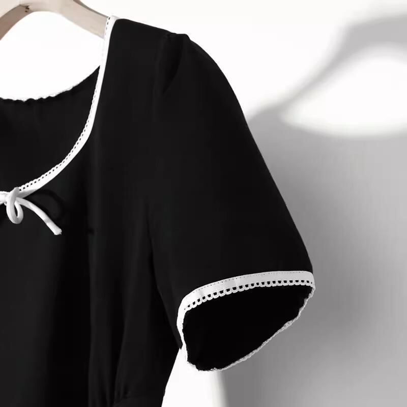 ワンピース レディース 大きいサイズ 配色切替 デザイン Aライン 着痩せ 体型カバー ロング丈 夏 ラウンドネック 半袖 綿混 ポリエステル ストレッチ 上品 通勤 フレンチスタイル ブラック