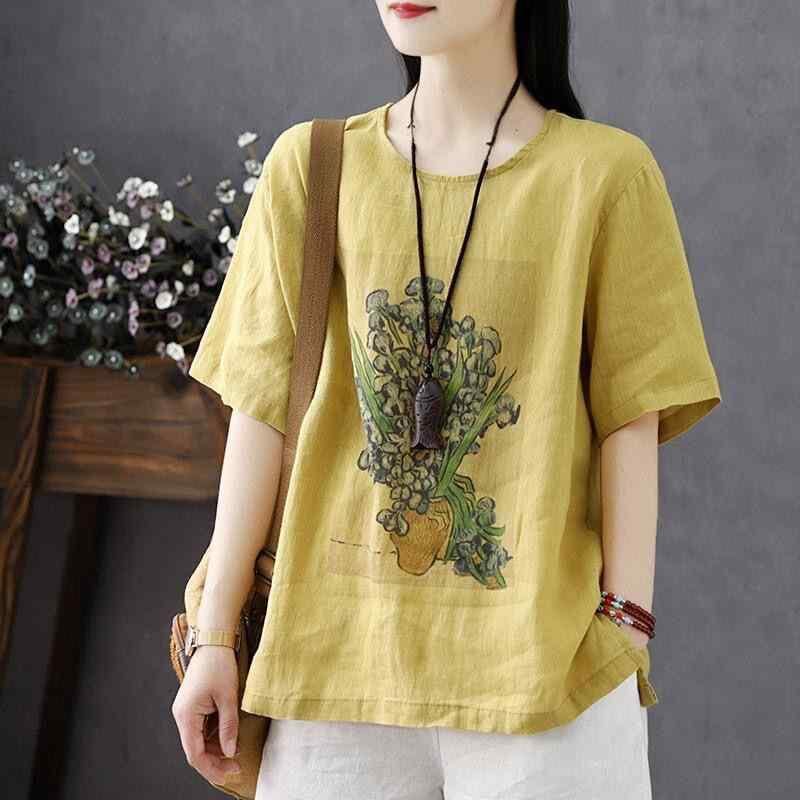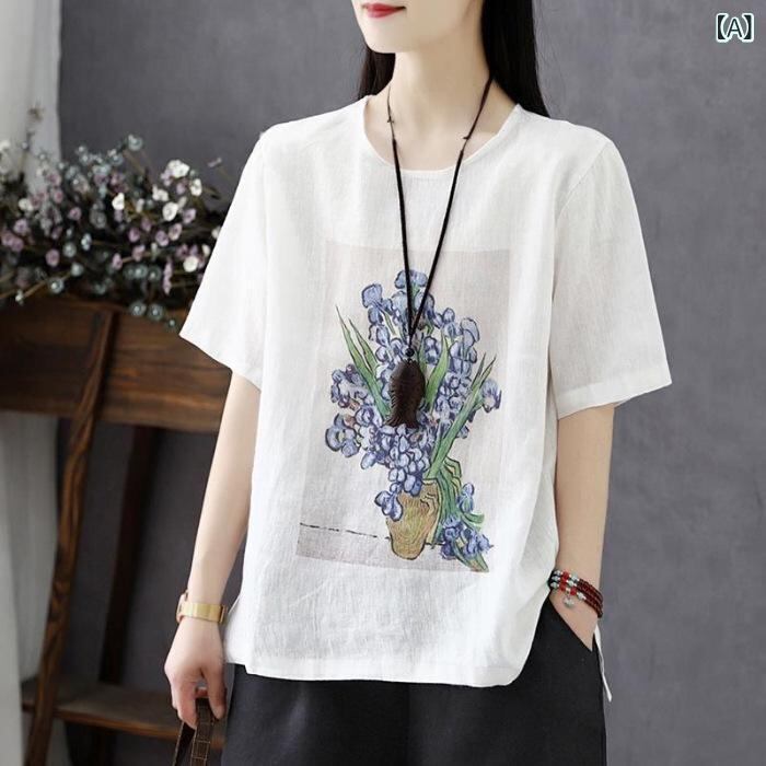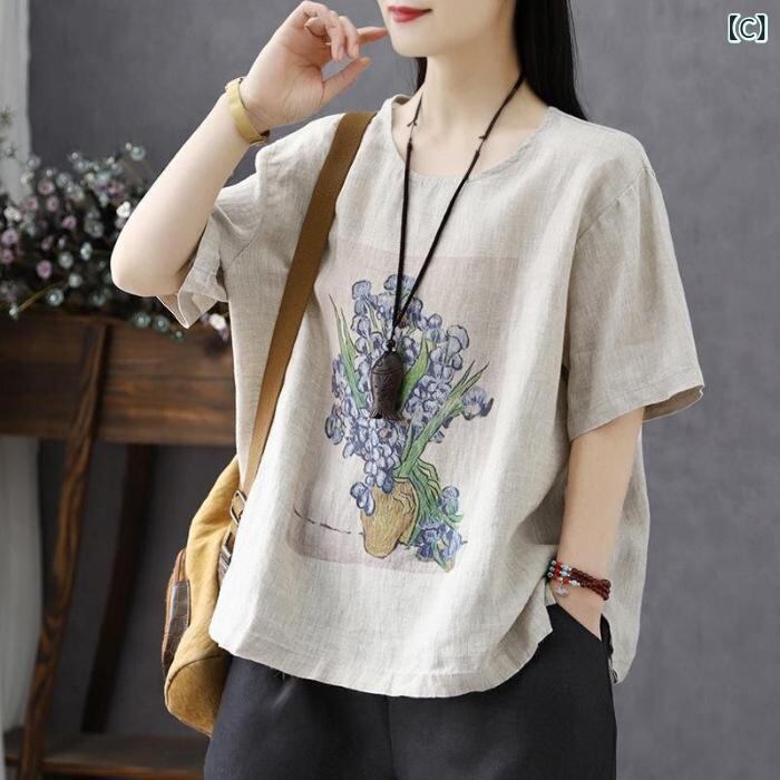 Tシャツ レディース 綿麻 半袖 ゆったり ルーズシルエット 大きいサイズ ビッグシルエット クルーネック プリント 花柄 レトロ カジュアル トップス 普段使い コットンリネン ポリエステル混 ストレッチ素材 体型カバー
