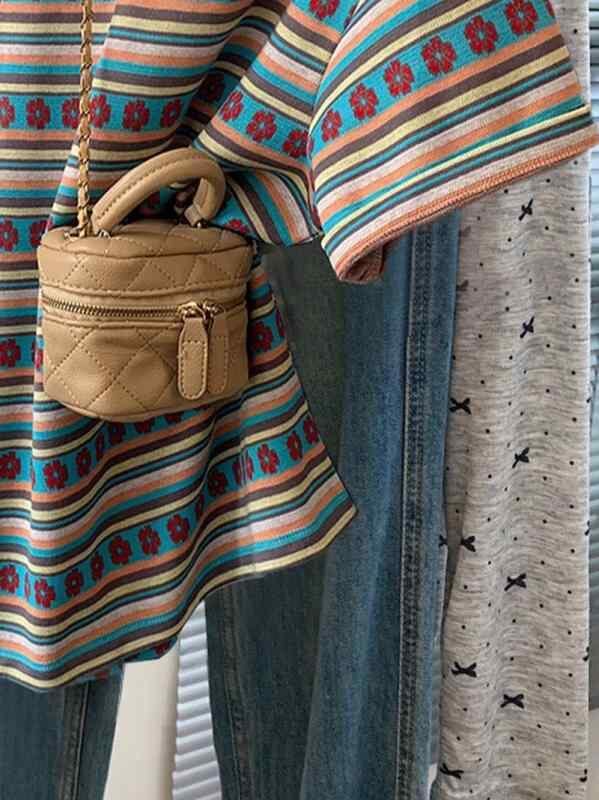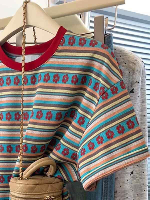 Tシャツ レディース 半袖 マルチカラー ストライプ クルーネック オーバーサイズ ゆったり ぽっちゃりさん向け 大きいサイズ 綿混素材 伸縮性 夏 カジュアル 普段着 デイリーユース