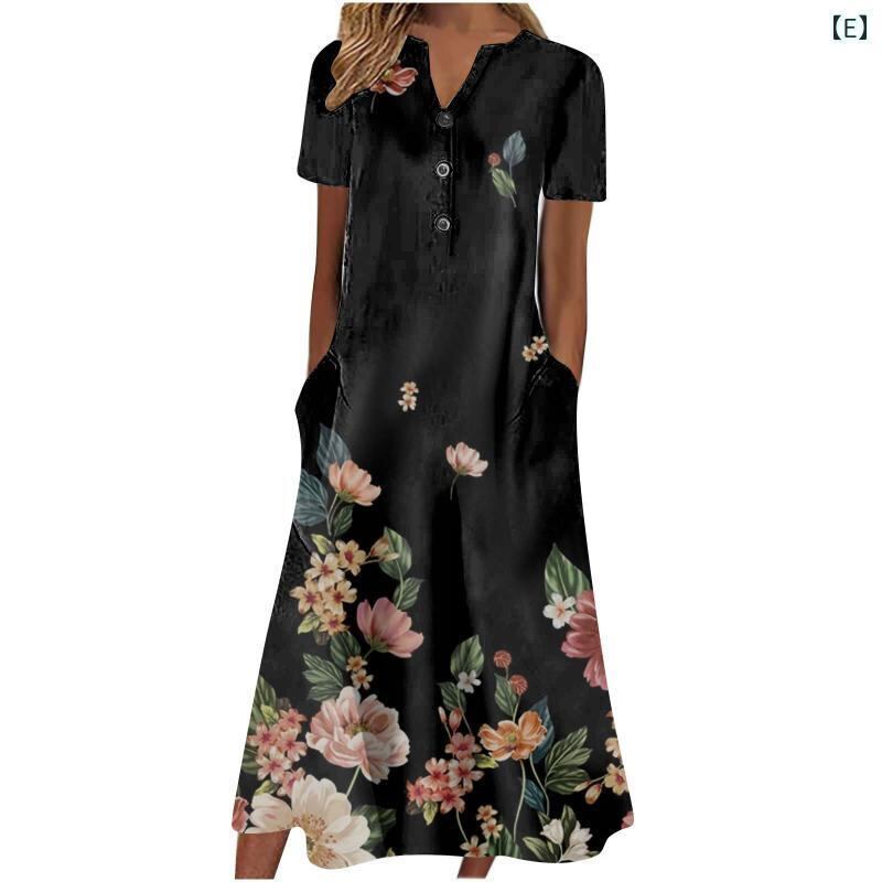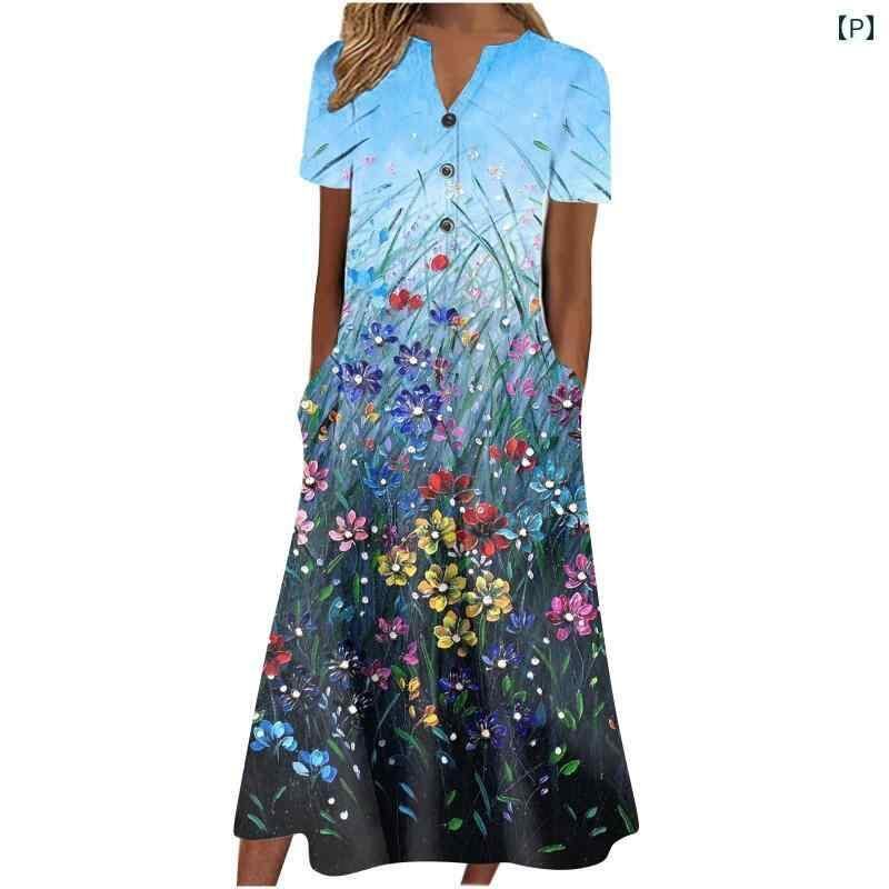ワンピース レディース 欧米風 カジュアル リラックス コンフォート Vネック ボタン 半袖 ゆったり フレア ロング丈 ハイウエスト プリント 幾何学模様柄 ポリエステル ポリウレタン 伸縮性 プルオーバー