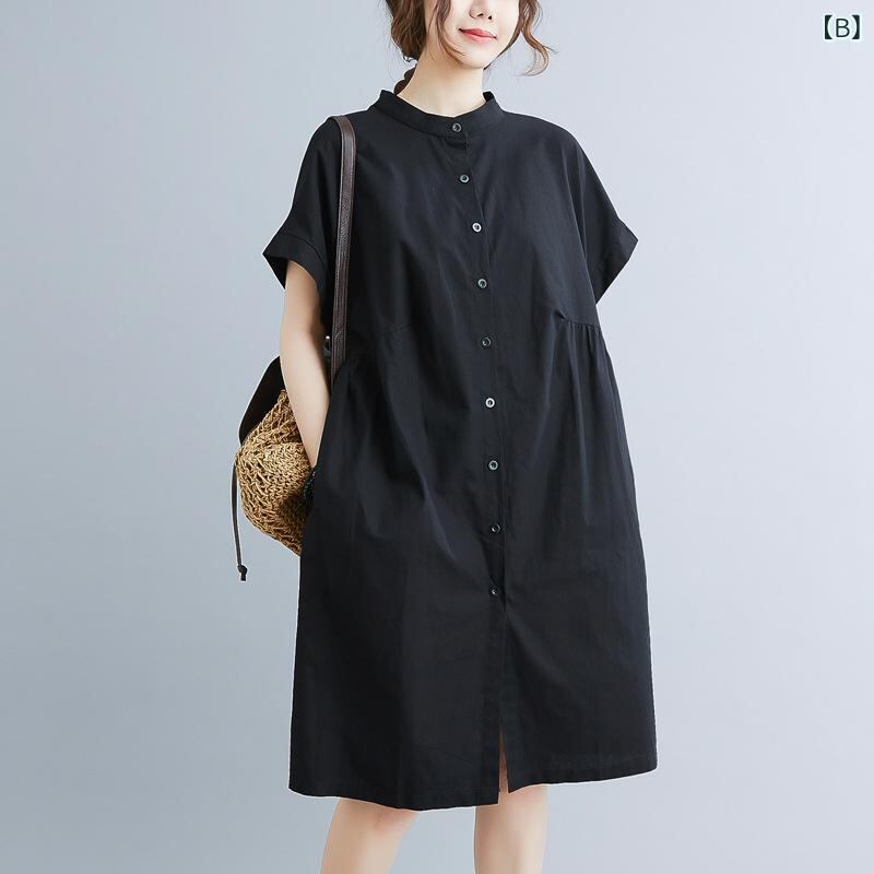 ワンピース レディース 半袖 ミモレ丈 Aライン ゆったり 無地 カジュアル ストリートスタイル 綿麻 コットンリネン 体型カバー リラックスフィット ハイネック フリル袖 ホワイト ブラック