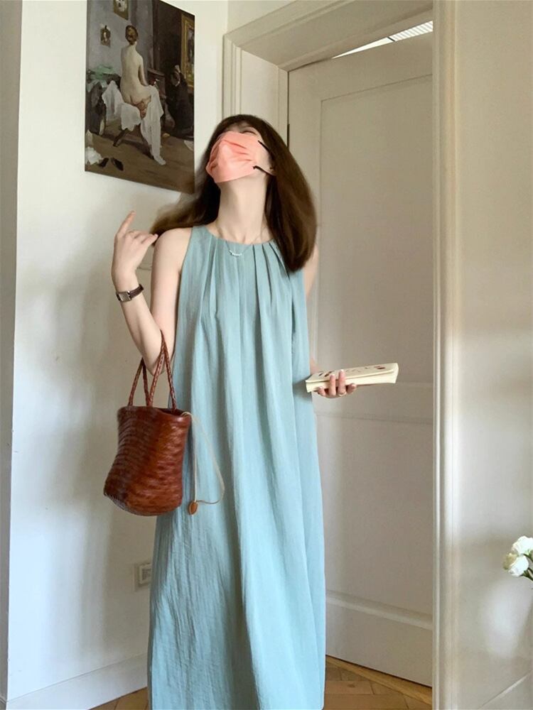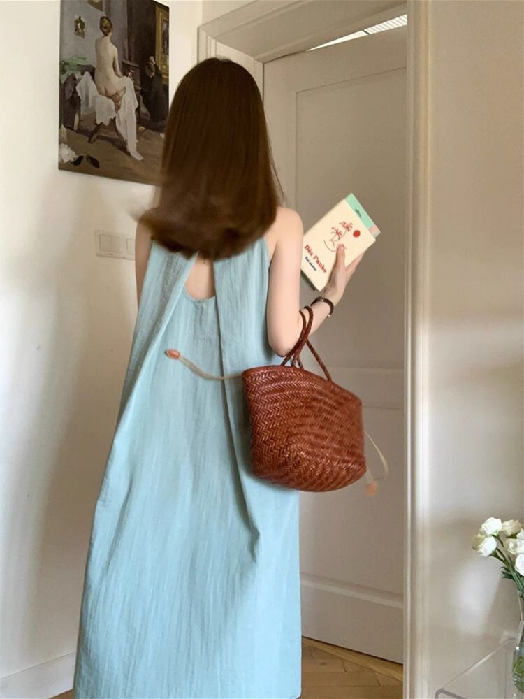 ワンピース レディース ホルターネック ノースリーブ バックオープン ミディ丈 Aラインロング ポリエステル フレンチ エレガント 通勤 リゾート ダスティグリーン