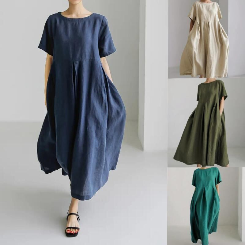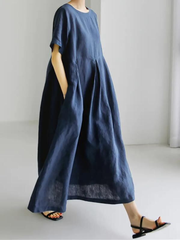ワンピース レディース ゆったり クルーネック 大きいサイズ 半袖 ミディ丈 無地 ポケット付き 切り替えデザイン ポリエステル素材 リラックス カジュアル 欧米風