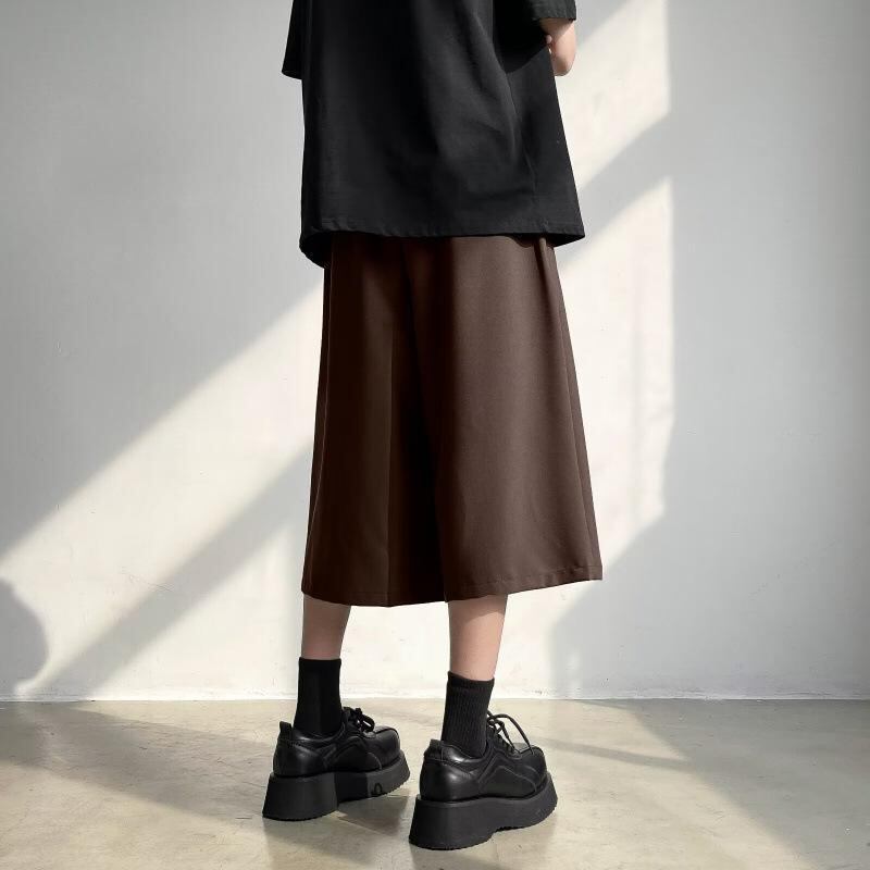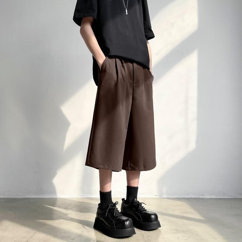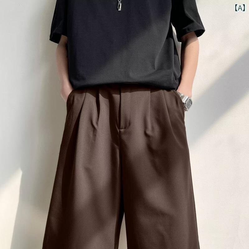 スラックス ハーフパンツ メンズ 夏用 薄手 軽量 ゆったり ワイド ストレート 膝丈 多機能ポケット ポリエステル混紡 形態安定 しわになりにくい 普段使い きれいめカジュアル ブラウン ブラック