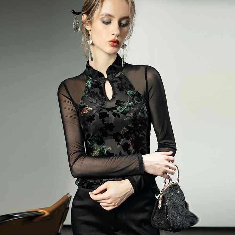 トップス レディース 中華風デザイン メッシュ切り替え 長袖 インナー スリムフィット ストレッチ スタンドカラー ボタニカル柄 フロッキー加工 秋冬 通勤 オフィス エレガント ポリエステル ポリウレタン
