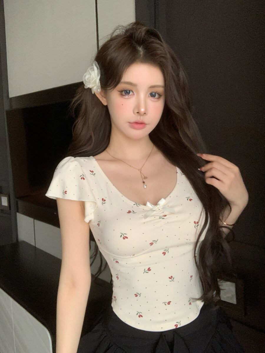 Tシャツ レディース リボン Vネック 半袖 花柄 プリント アシンメトリー ショート丈 綿混 スパンデックス配合 細見え スタイルアップ クロップド丈 ヘルシーセクシー カジュアル 大人かわいい 上品きれいめ 肩周りすっきり