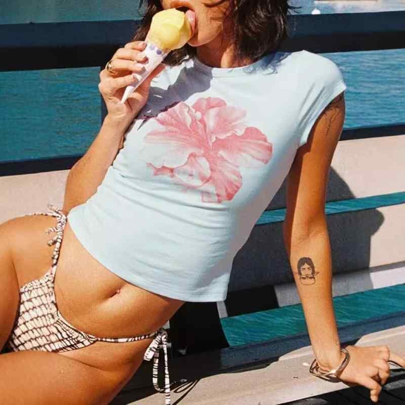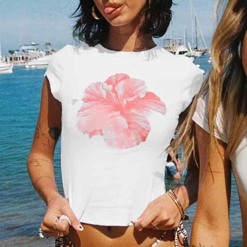 Tシャツ レディース 立体花柄プリント 半袖 デザイン袖 セクシー スリムフィット 通気性 コットン 丸首 トップス カジュアルスタイル 通勤 オフィス デート 夏コーデ ホワイト ブルー イエロー