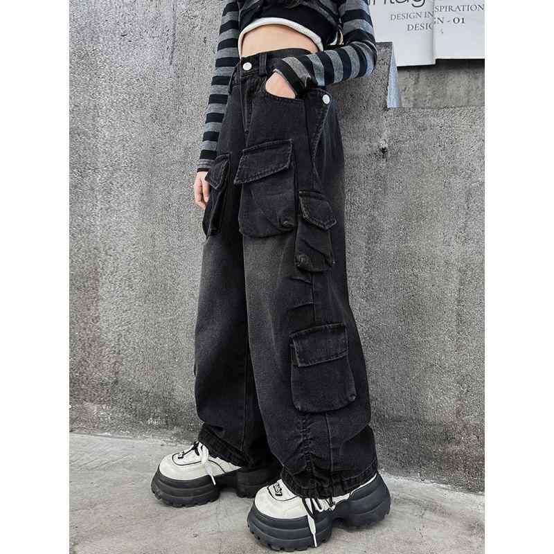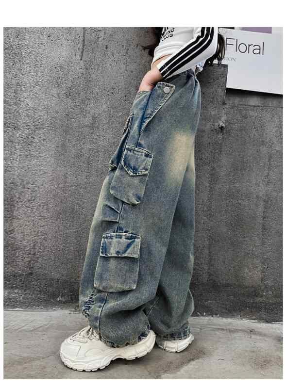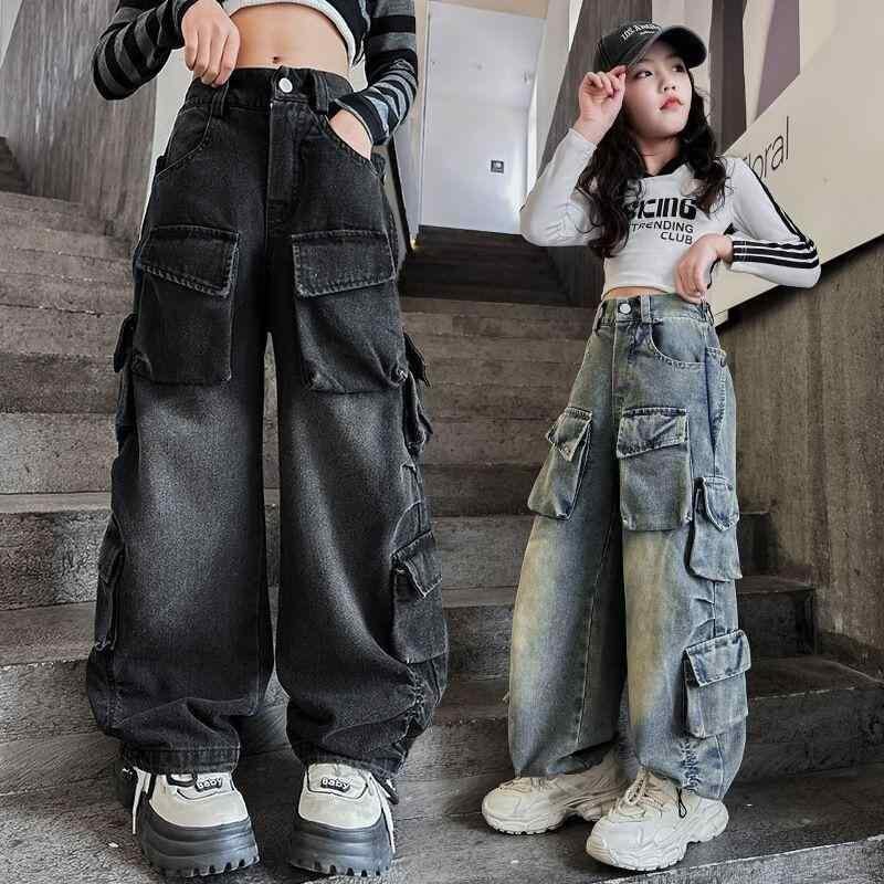 デニムパンツ 女の子 キッズ ガールズ ワーク デニム カーゴパンツ ビッグポケット ゆったり ルーズシルエット ストリートファッション ダンス衣装 ヒップホップ ウエストゴム コットン素材 柔らかい肌触り ブルー ブラック