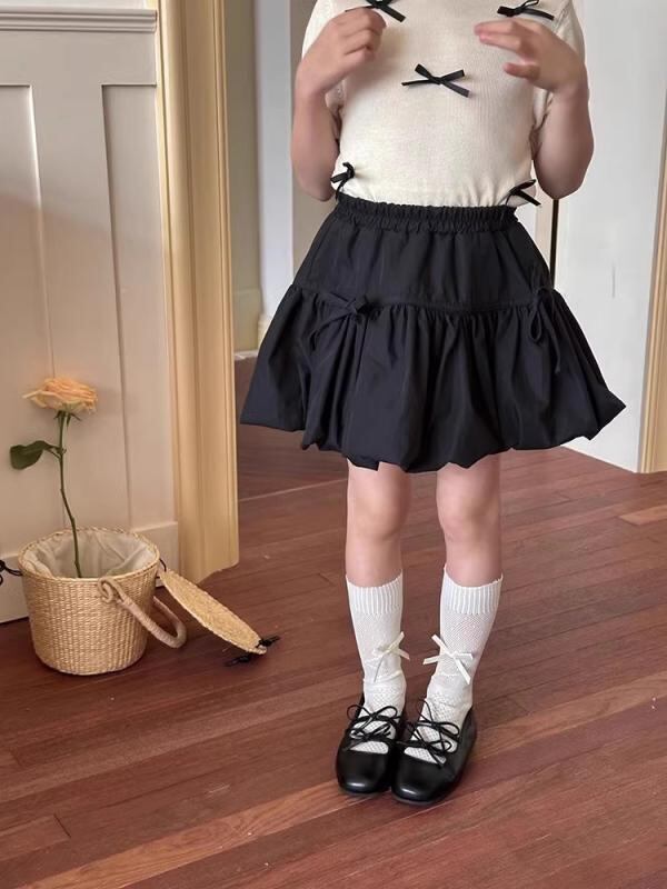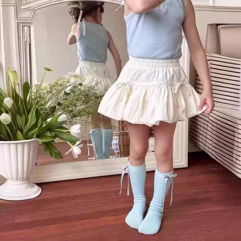 童裙 女の子 キッズ 韓国スタイル リボン バルーンスカート プリンセス ティアードスカート フレア 半身スカート カジュアル かわいい 着回し ポリエステル混紡 裏地付き 安全パンツ一体型 ホワイト ブラック ベージュ ピンク