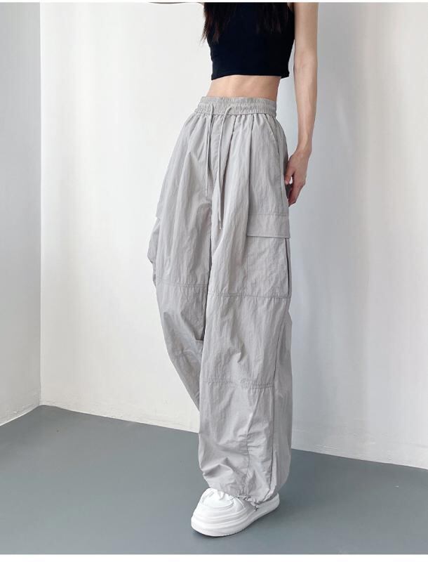 パンツ レディース 大きいサイズ ゆったり 体型カバー 細見え ストレートパンツ ハイウエスト ロング丈 ドローコード 速乾 接触冷感 薄手 微ストレッチ 伸縮性 ポリエステル スポーツ リラックス カジュアル グレー ブラック
