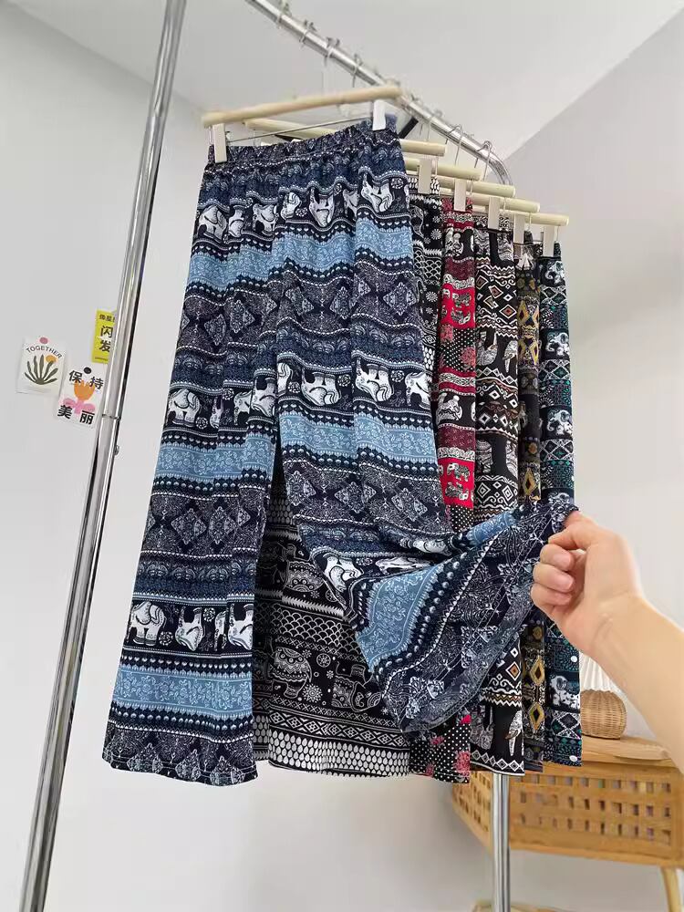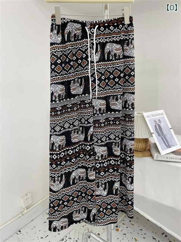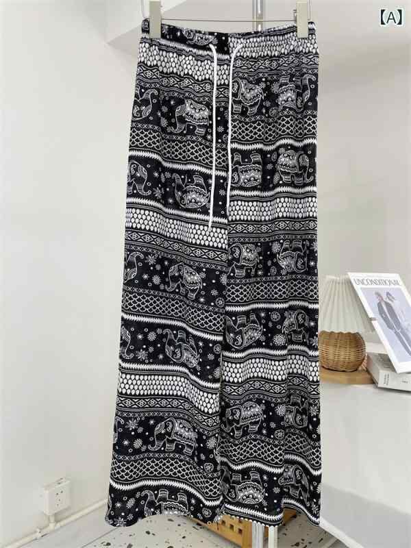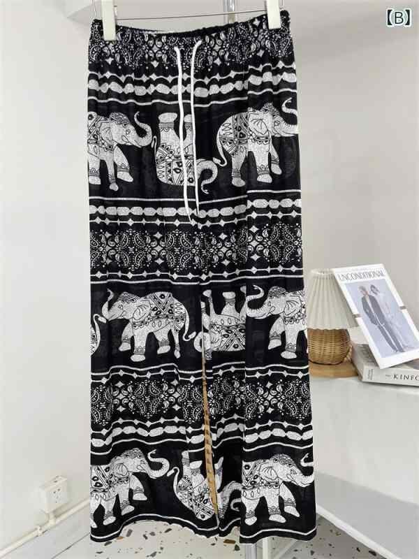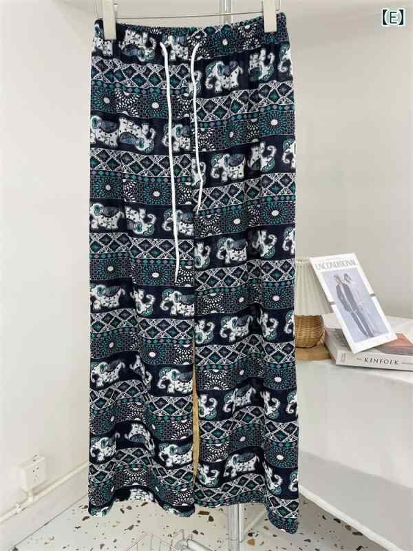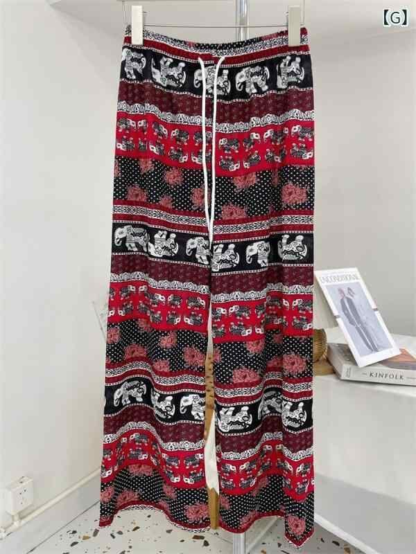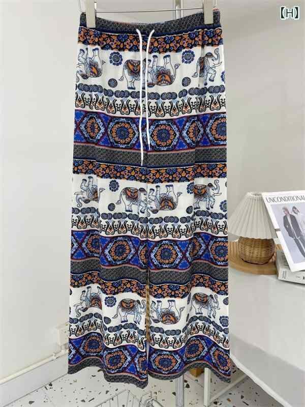 パンツ レディース エレファント ワイドストレートパンツ ハイウエスト 落ち感 ゆったり ロング丈 カジュアル 薄手 ポリエステル ストレッチ ドローストリング エスニック レトロ