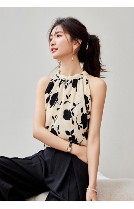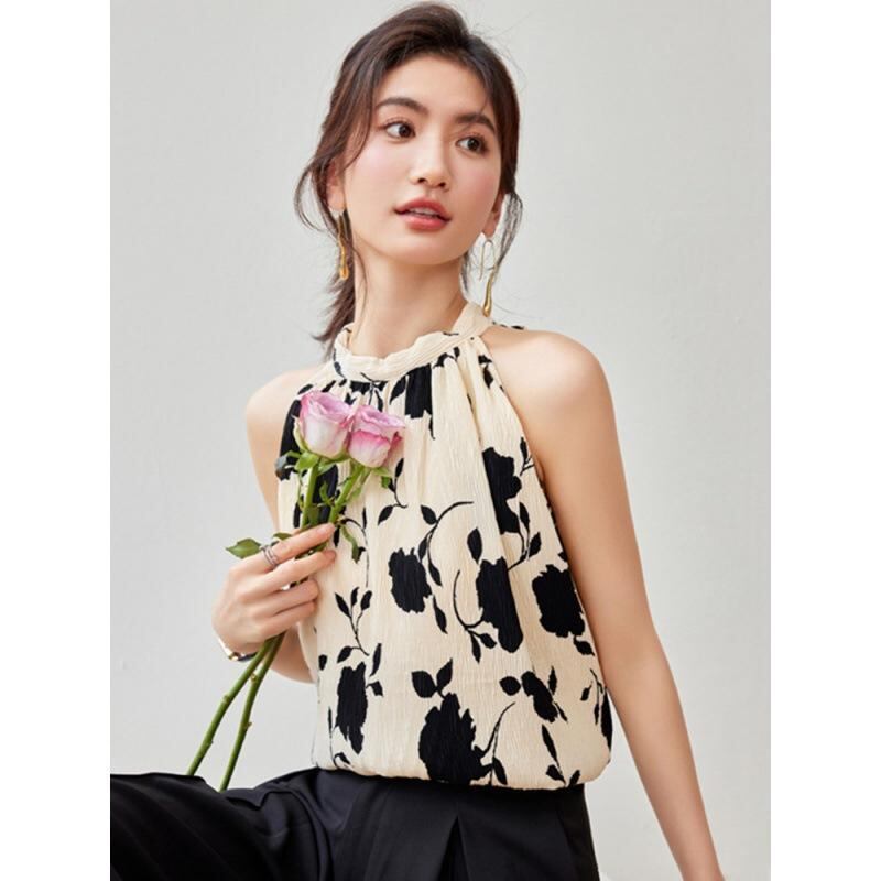 トップス レディース ホルターネック 韓国ファッション ノースリーブ ゆったり バックリボン ギャザー プリント柄 体型カバー キャミソール アプリコット ベージュ ポリエステル 丸首 微ストレッチ 上品 エレガント
