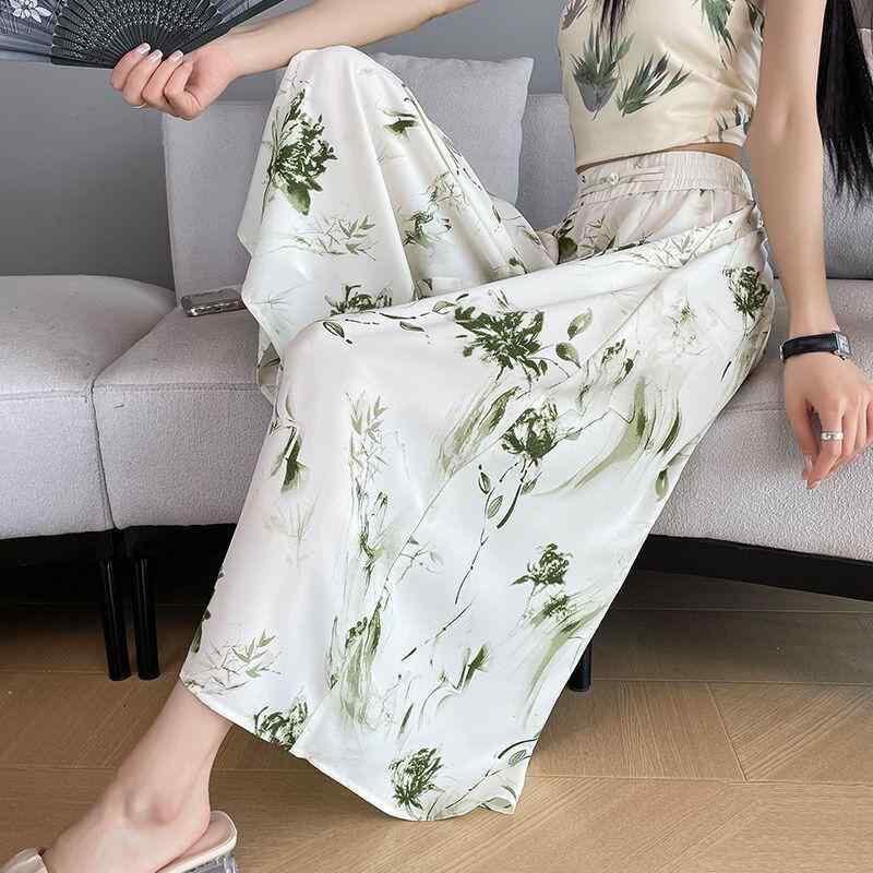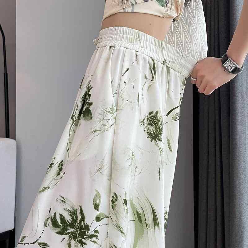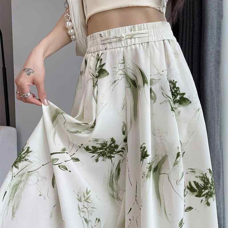 パンツ レディース 夏用 薄手 軽量 ゆったり ワイドパンツ スカーチョ ガウチョパンツ ハイウエスト 七分丈 水墨画柄 和風 カジュアル リラックスフィット ポリエステル 黒白 グリーン系