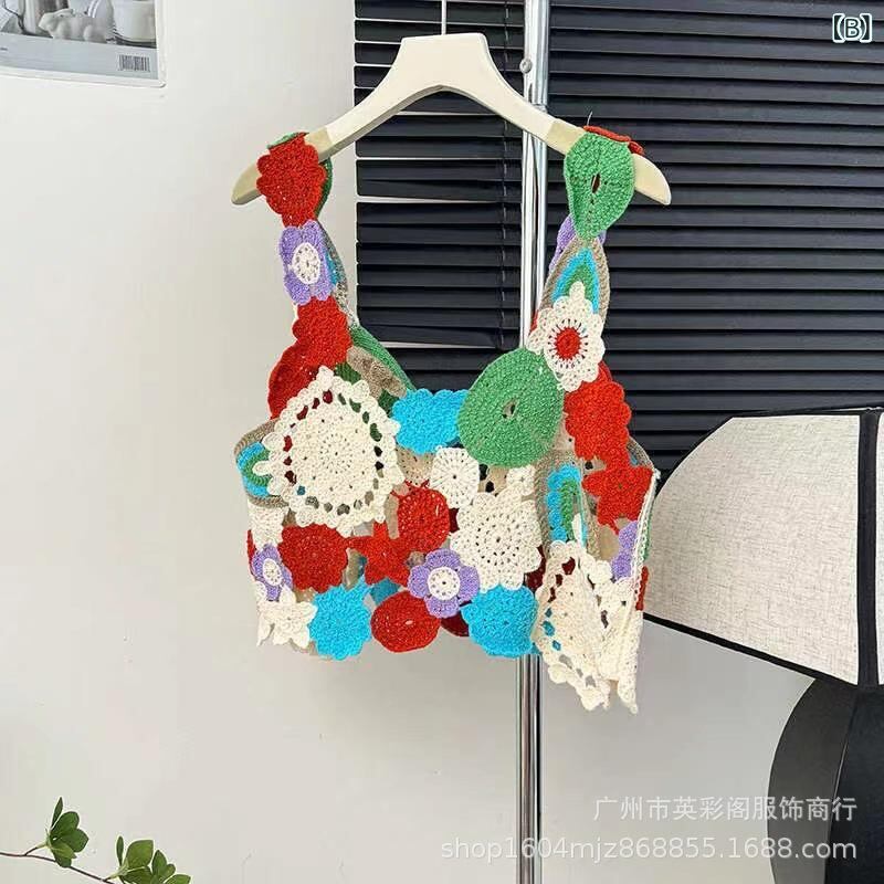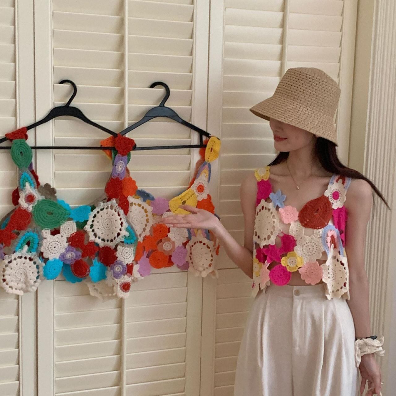 サマーニット キャミソール レディース ドーパミンカラー カラフル 花柄 クロシェ編み 透かし編み ショート丈 ゆったり コットン ストレッチ スウィート フェミニン デザイン 個性的