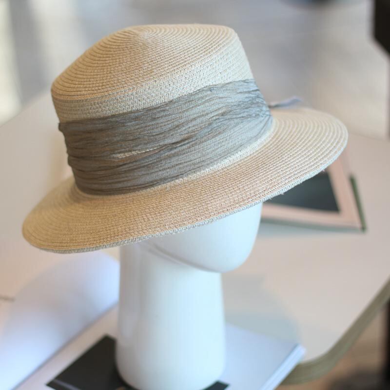 麦わら帽子 フレンチ エレガント プリーツ リボン 平天帽 広つば ストローハット カジュアル リゾート 日よけ UVカット 紫外線対策 防風 調節可能 パープル カーキ グレージュ ブラック