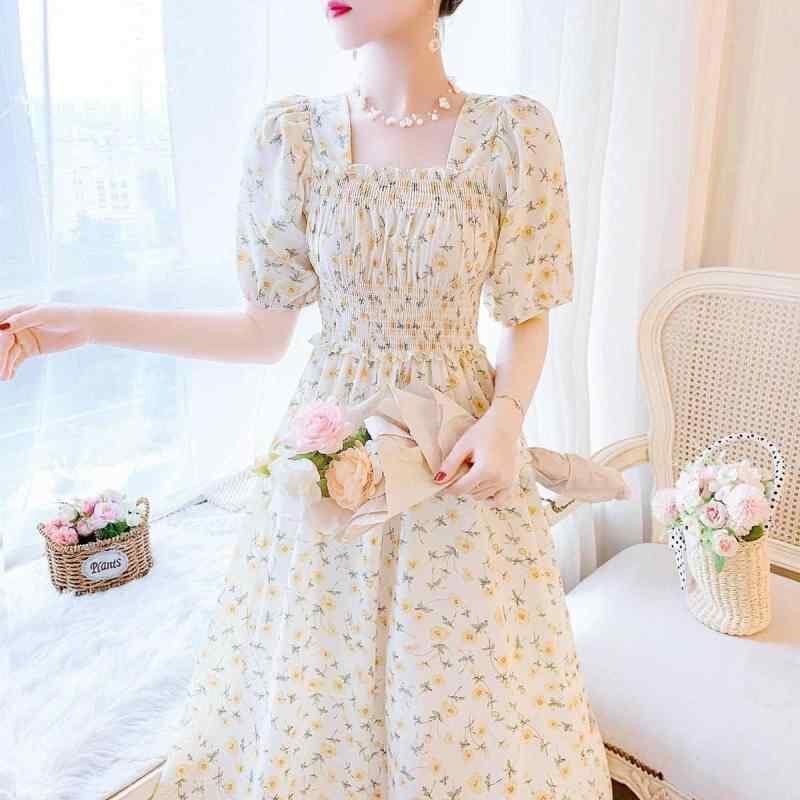 ワンピース レディース 大きいサイズ プラスサイズ フレンチスタイル エレガント 上品 スクエアネック Aライン パフスリーブ 小花柄 ミディ丈 ギャザー ポリエステル 夏 イエロー 普段使い 体型カバー