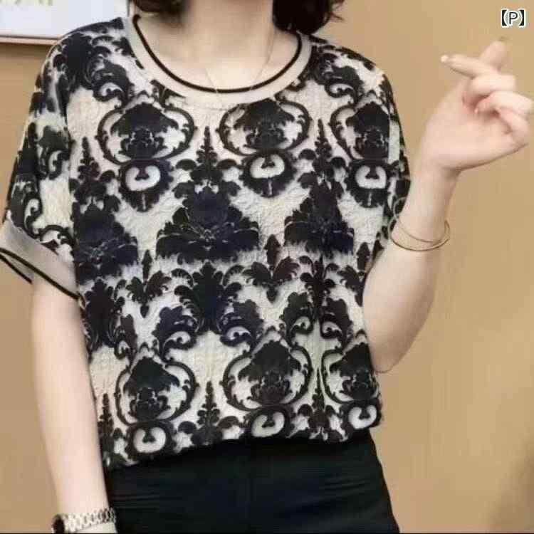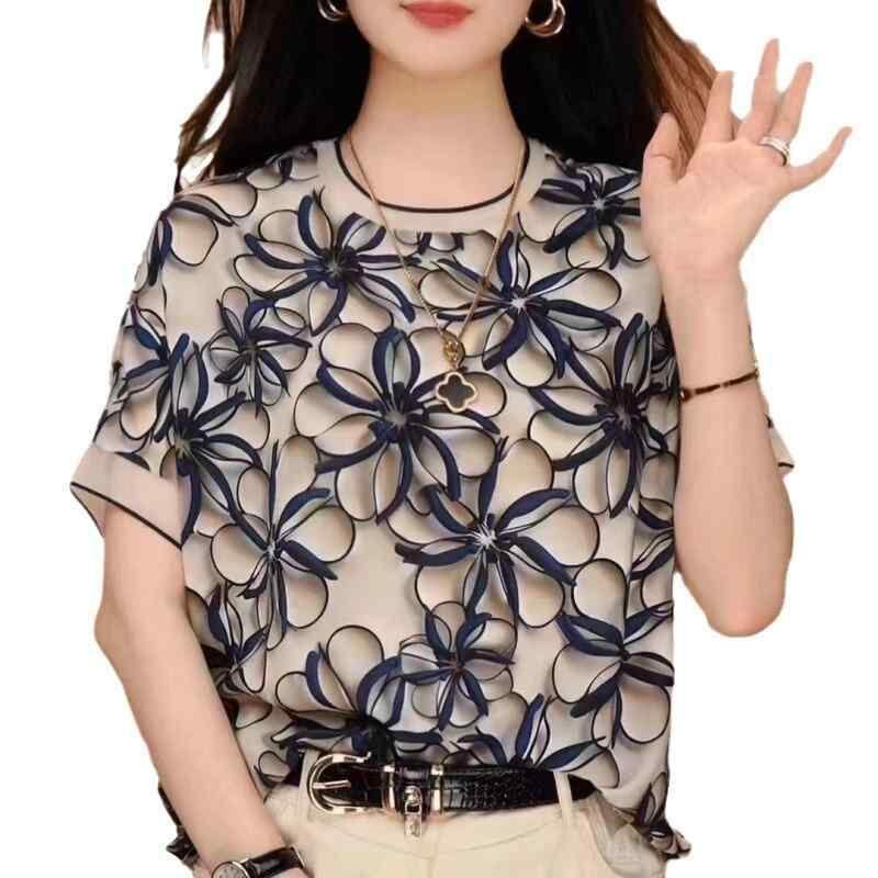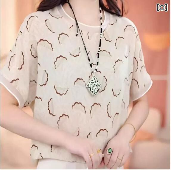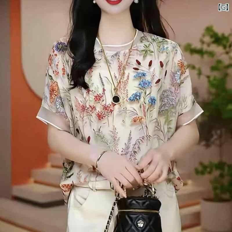 Tシャツ レディース ドロップショルダー ラウンドネック 半袖 ゆったり 体型カバー 3D立体 向日葵プリント シフォン ポリエステル素材 カジュアル 普段使い 通勤 トップス カットソー