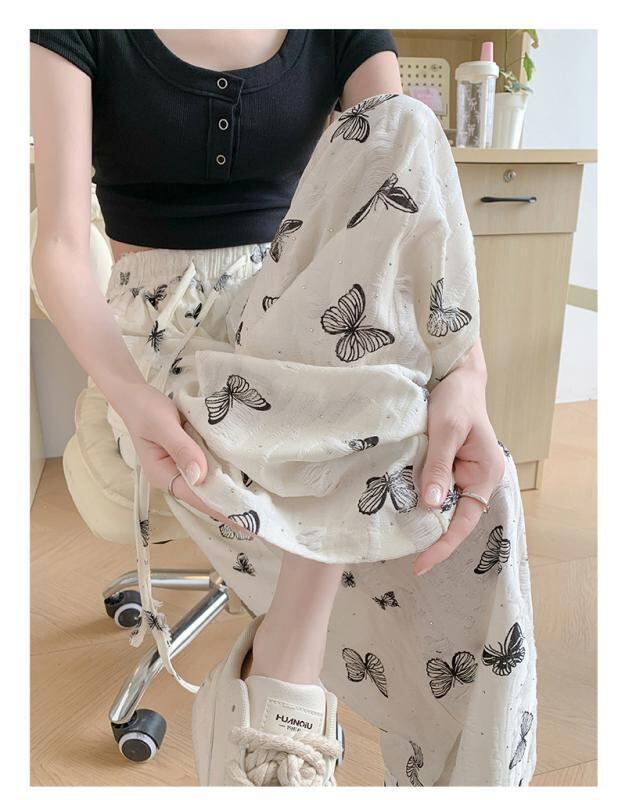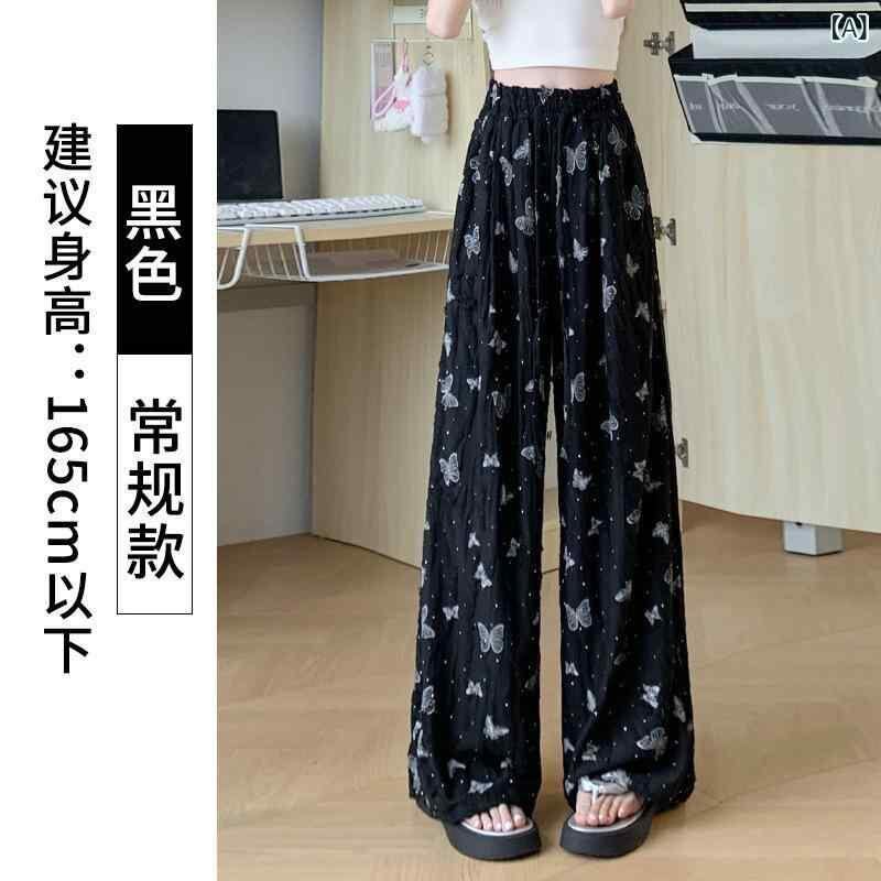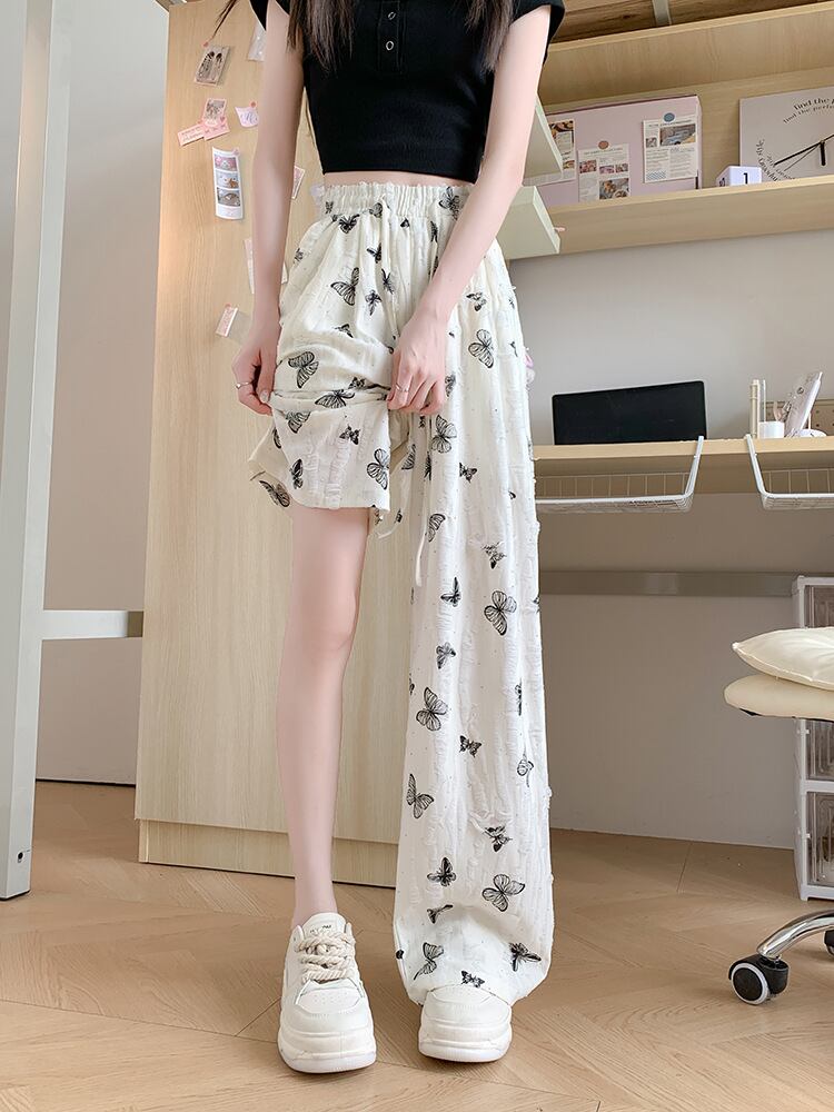 ワイドパンツ レディース ハイウエスト ドレープ感 接触冷感 蝶柄 ダメージ加工 小柄 低身長向け カジュアル ゆったり リラックス フルレングス 薄手 高ストレッチ ポリエステル レーヨン 普段使い おうち時間 ブラック オフホワイト