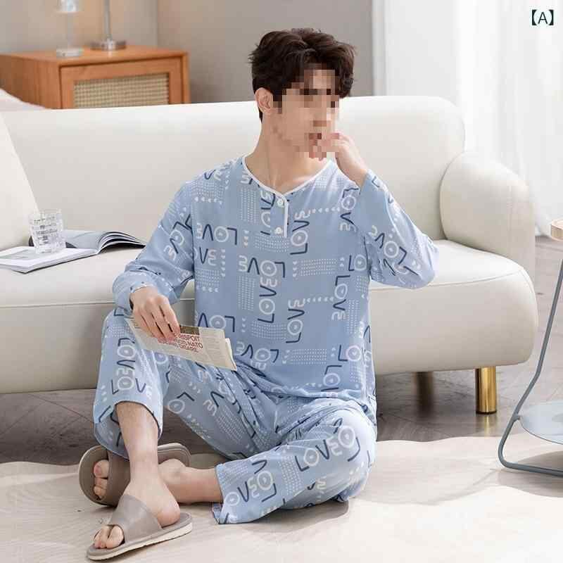 パジャマ ルームウェア メンズ 男性用 上下セット 長袖 長ズボン ロングパンツ 薄手 軽量 超薄手 夏用 綿混 接触冷感 さらさら 丸首 ラウンドネック プリント柄 総柄 シンプル 寝巻き 部屋着