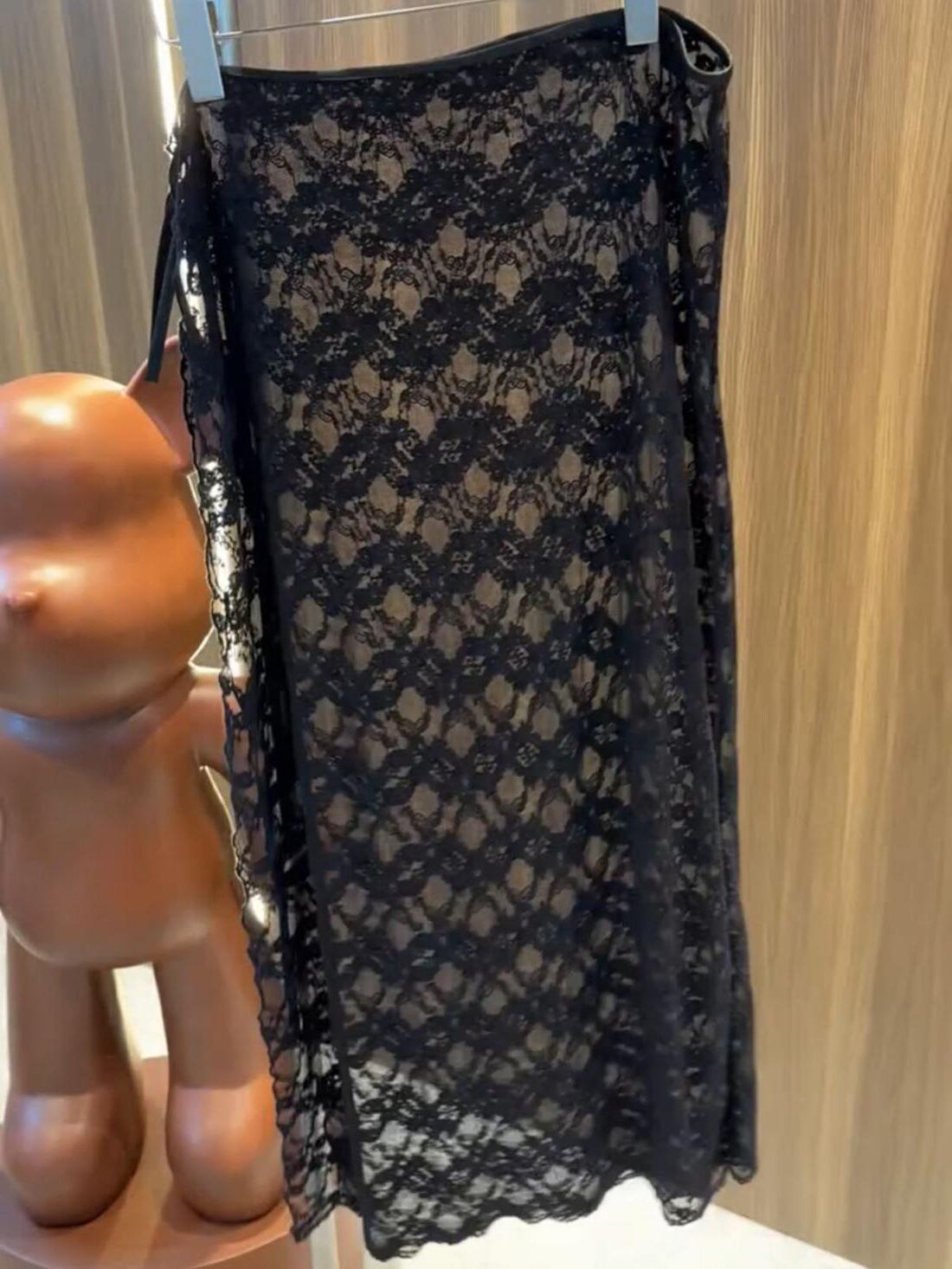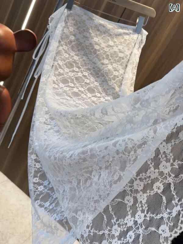 スカート レディース 大きいサイズ ぽっちゃりさん向け レース 透かし編み 体型カバー ラップ風 スリット入り ウエストリボン アシンメトリー ミディ丈 カジュアル リラックススタイル 着回し ポリエステル ホワイト ブラック