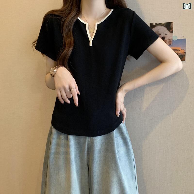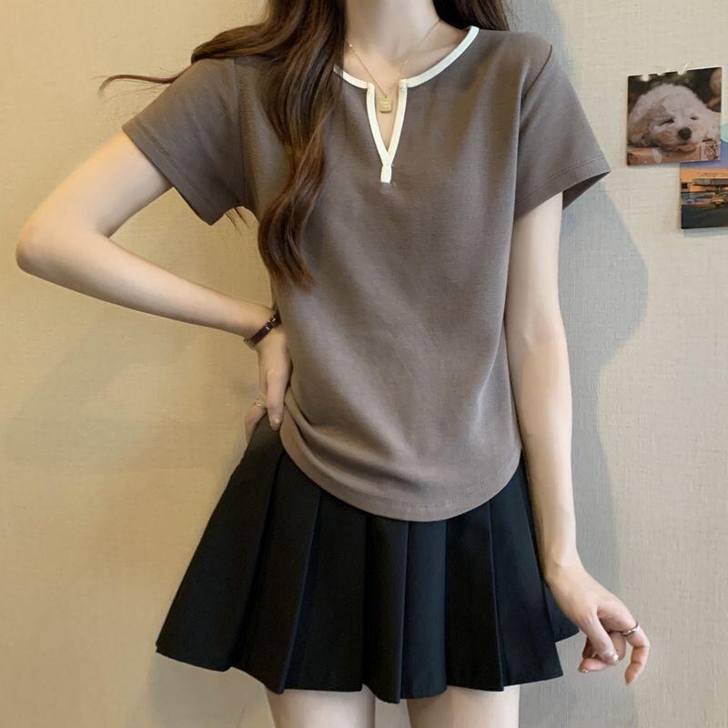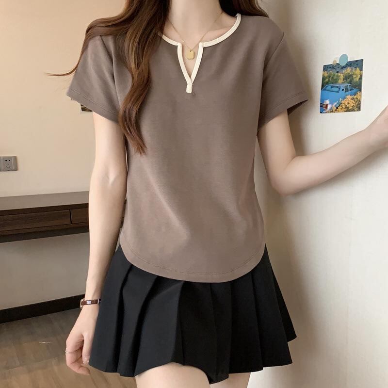 Tシャツ レディース トップス 半袖 Vネック ゆったり 大きいサイズ プラスサイズ 体型カバー 着痩せ効果 韓国風ファッション 配色デザイン ポリエステル イージーケア ブラウン系 ブラック