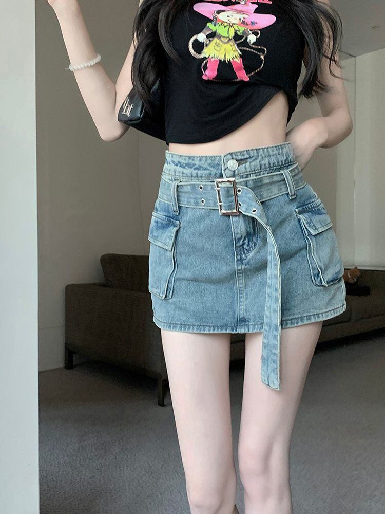 半身スカート レディース 大きいサイズ ゆったり デニム 夏 アメリカン レトロ ワークスタイル カジュアル インナーパンツ付き ハイウエスト Aライン ショート丈 ストレッチ 無地 ブルー