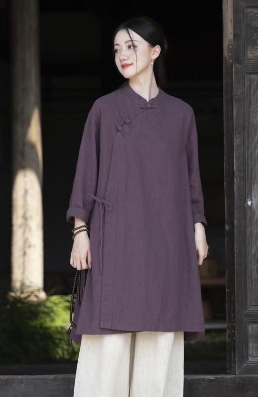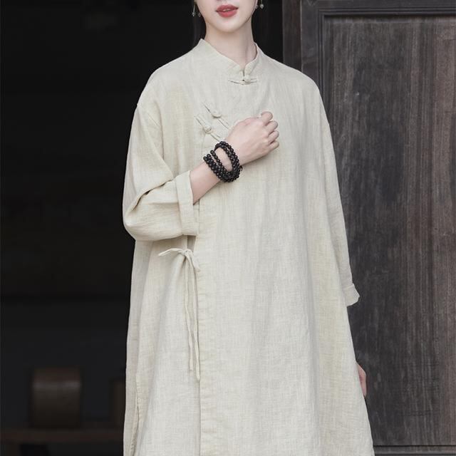 ワンピース 中国風 レトロ 綿麻 Aライン ミドル丈 スタンドカラー 長袖 飾りボタン チャイナボタン 斜め前合わせ 紐付き ゆったり 禅風 茶道服 カジュアル リラックスウェア 普段使い お出かけ 着物風