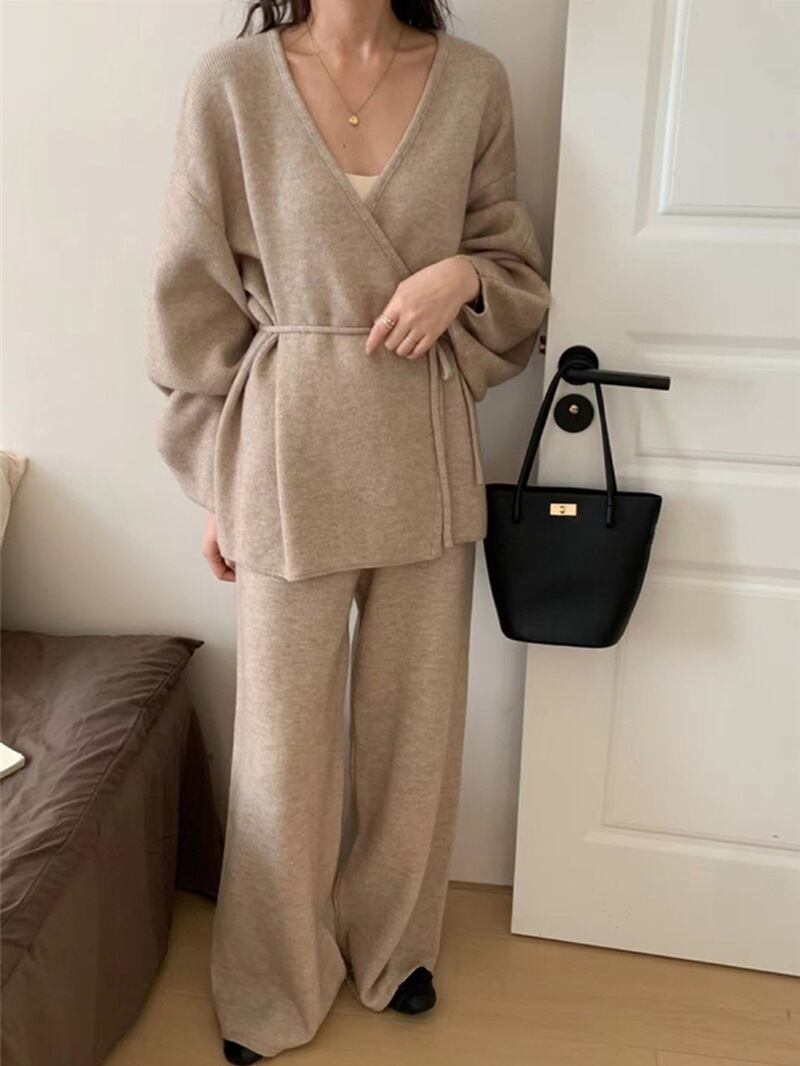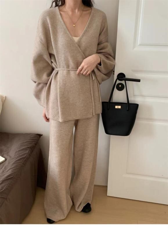 ニット セットアップ レディース ゆったり リラックス ルーズ カーディガン ワイドパンツ ツーピース ポリエステル ナイロン 長ズボン オートミール ブラック カジュアル スタイル アメリカンレトロ 普段使い おうち時間