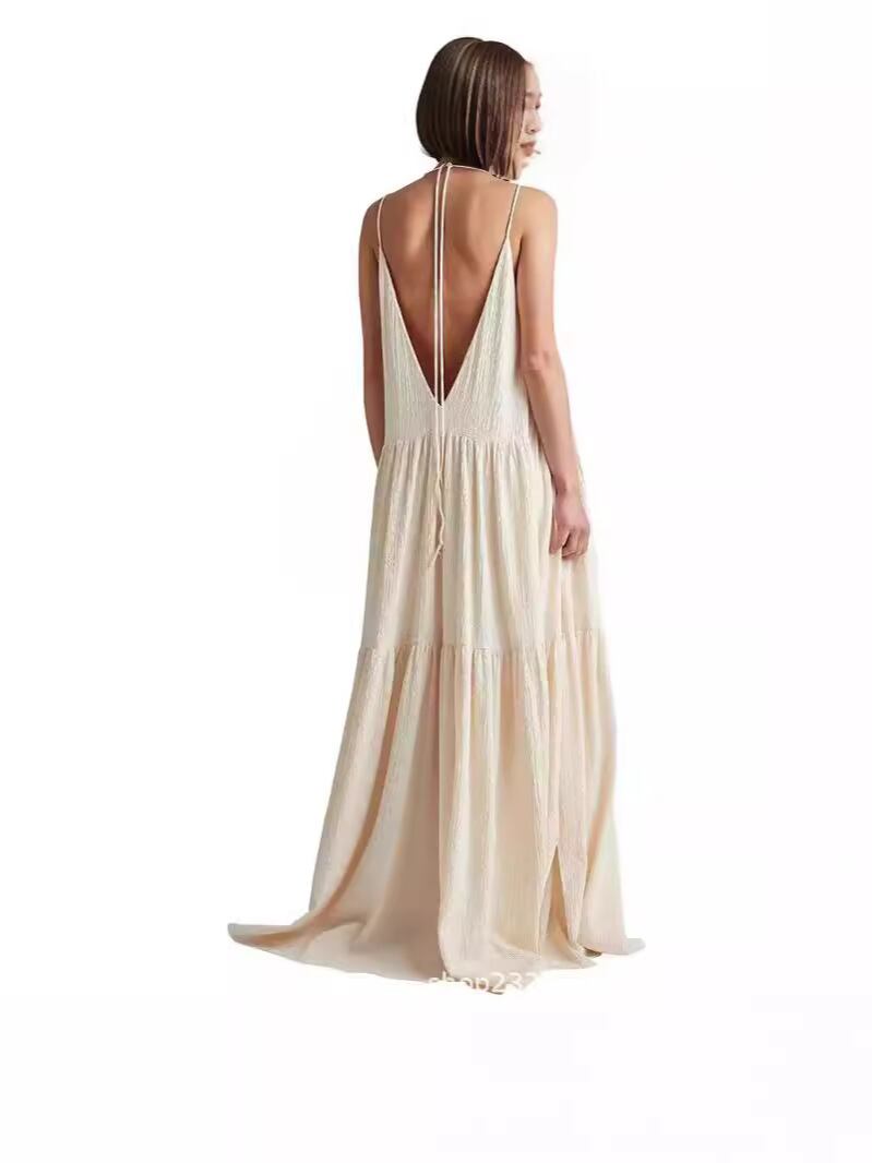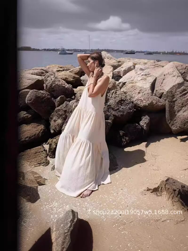 ワンピース レディース ゆったり リラックスフィット 無地 プリーツ アシンメトリー 変形デザイン キャミソール ロング丈 マキシ丈 ビーチ リゾート エレガント ドレープ 体型カバー オフホワイト ドレス