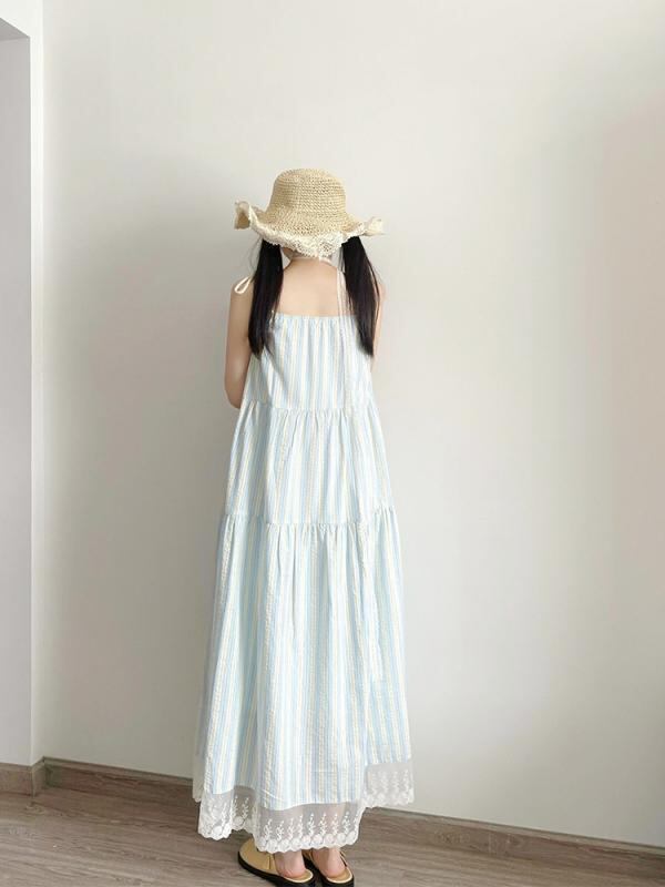 ワンピース レディース ストライプ柄 キャミソール ロング丈 ビーチ リゾート フレンチテイスト エレガント 上品 ゆったり 小柄向け ポリエステル素材 ハイウエスト